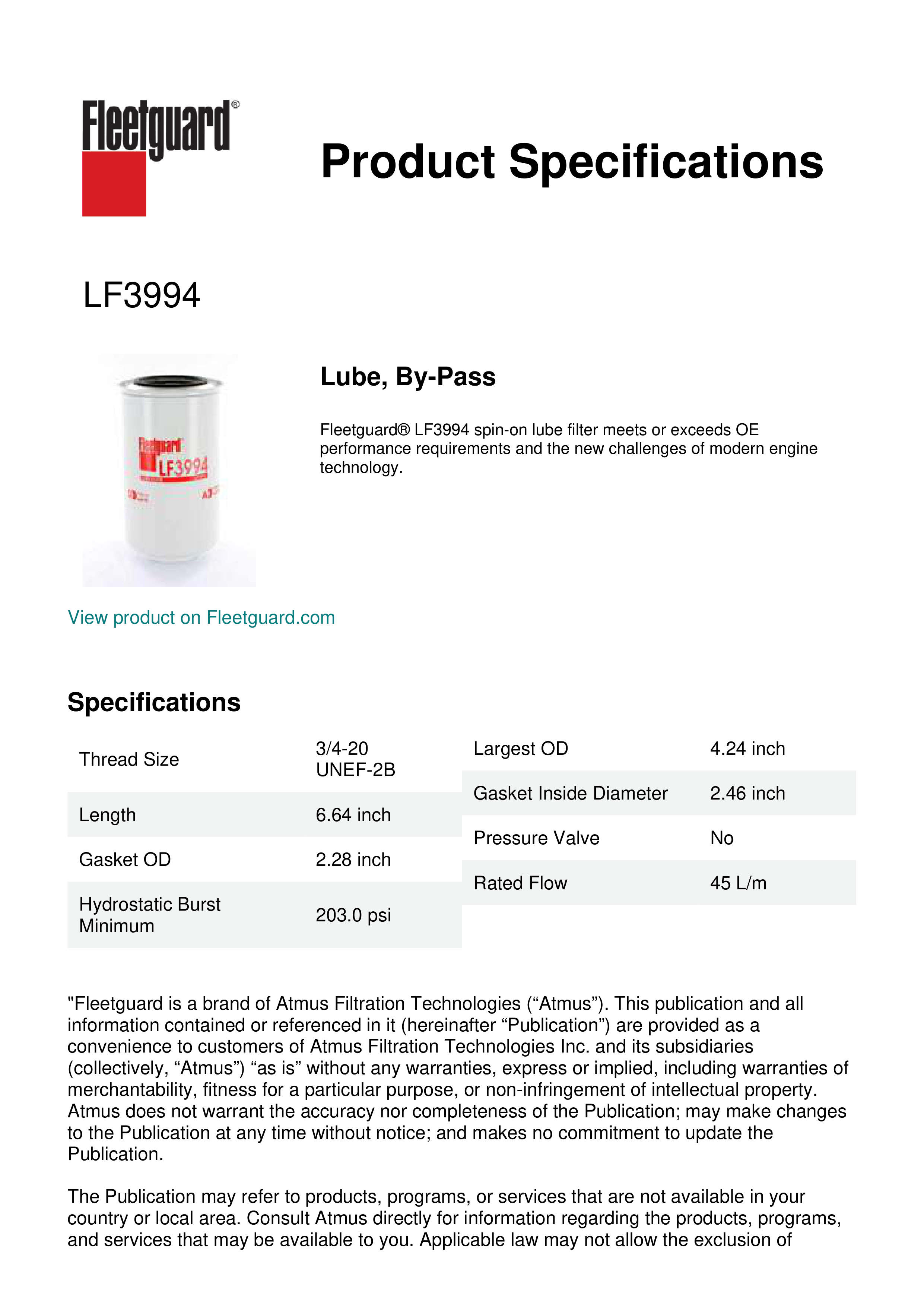 Fleetguard® LF3994 spin-on lube filter meets or exceeds OE performance requirements and the new challenges of modern engine technology.Specification