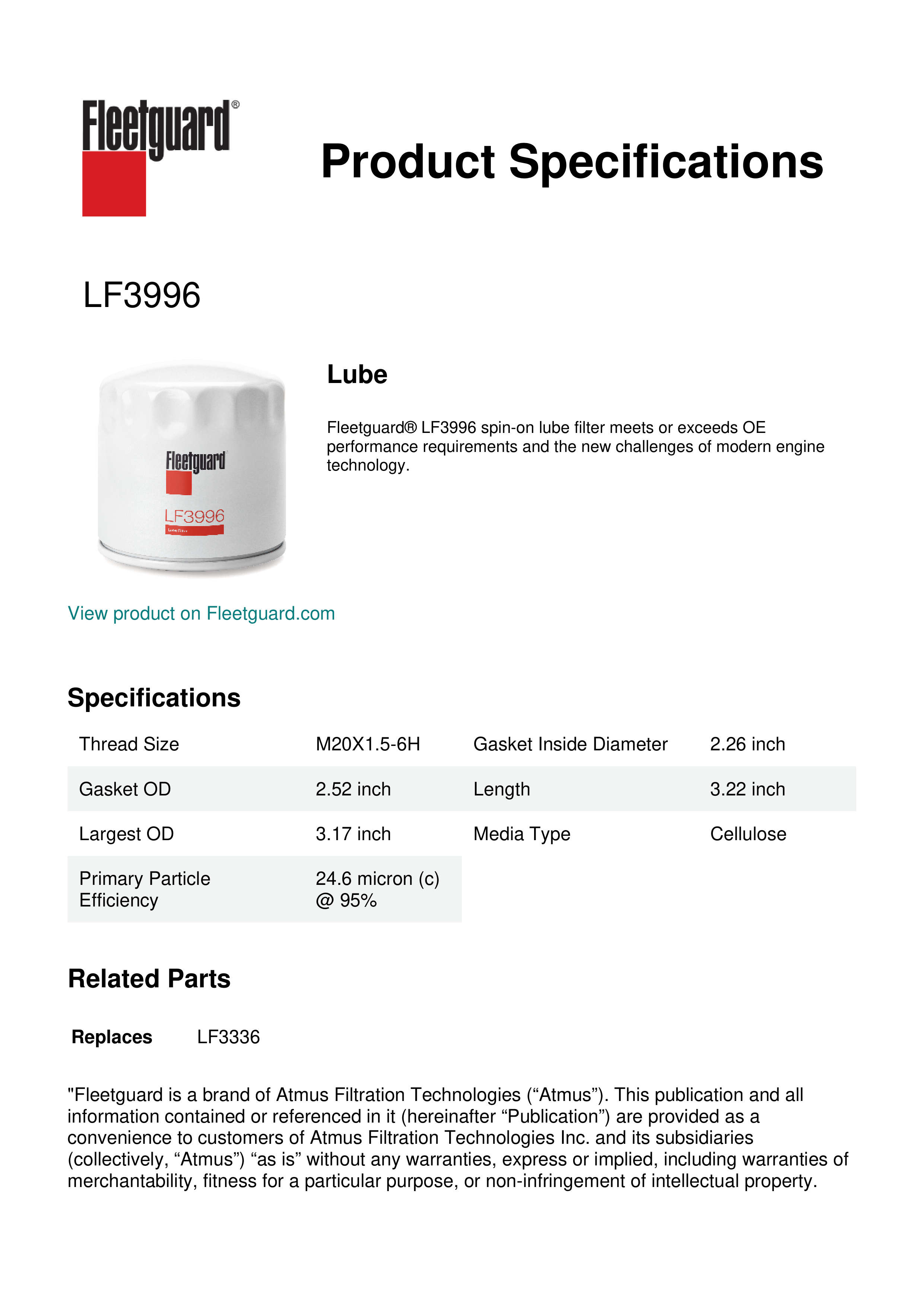 Fleetguard® LF3996 spin-on lube filter meets or exceeds OE performance requirements and the new challenges of modern engine technology.Specification