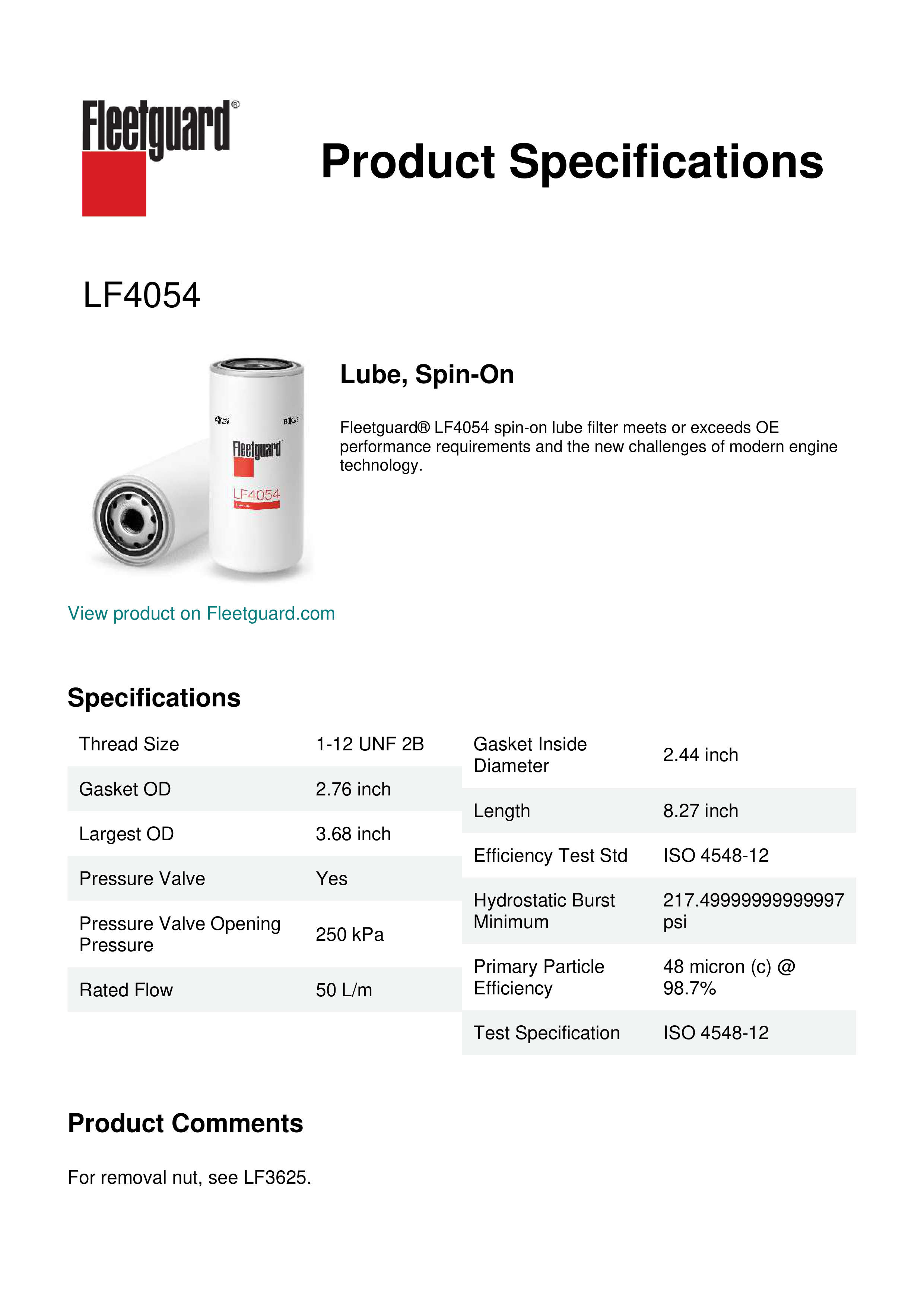Fleetguard® LF4054 spin-on lube filter meets or exceeds OE performance requirements and the new challenges of modern engine technology.Specification