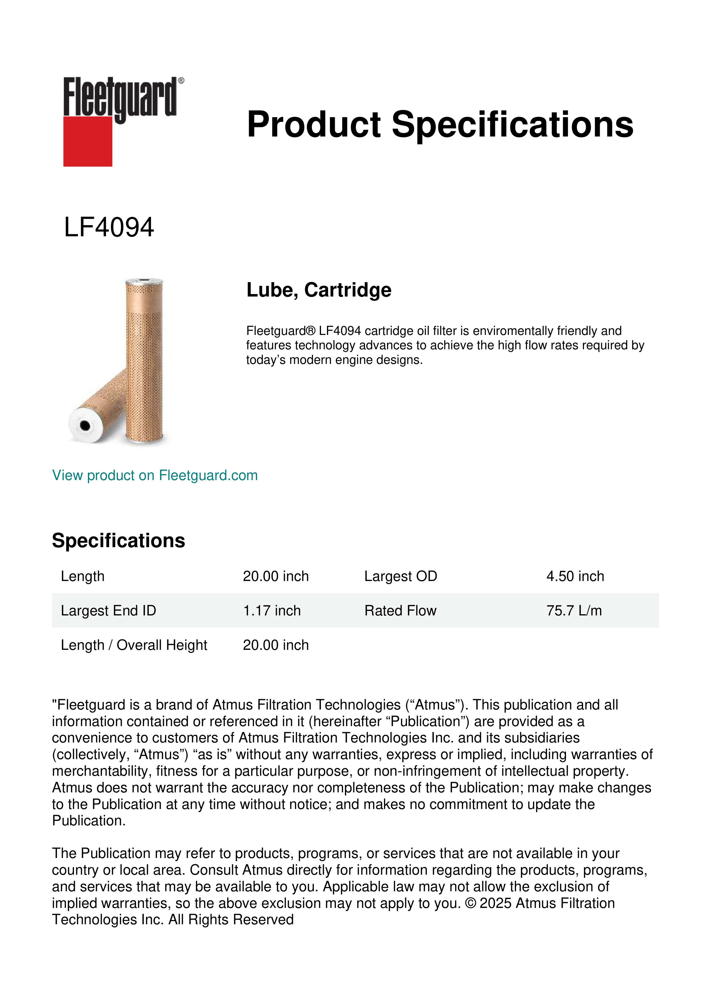 Fleetguard® LF4094 cartridge oil filter is enviromentally friendly and features technology advances to achieve the high flow rates required by today’s modern engine designs.Specification