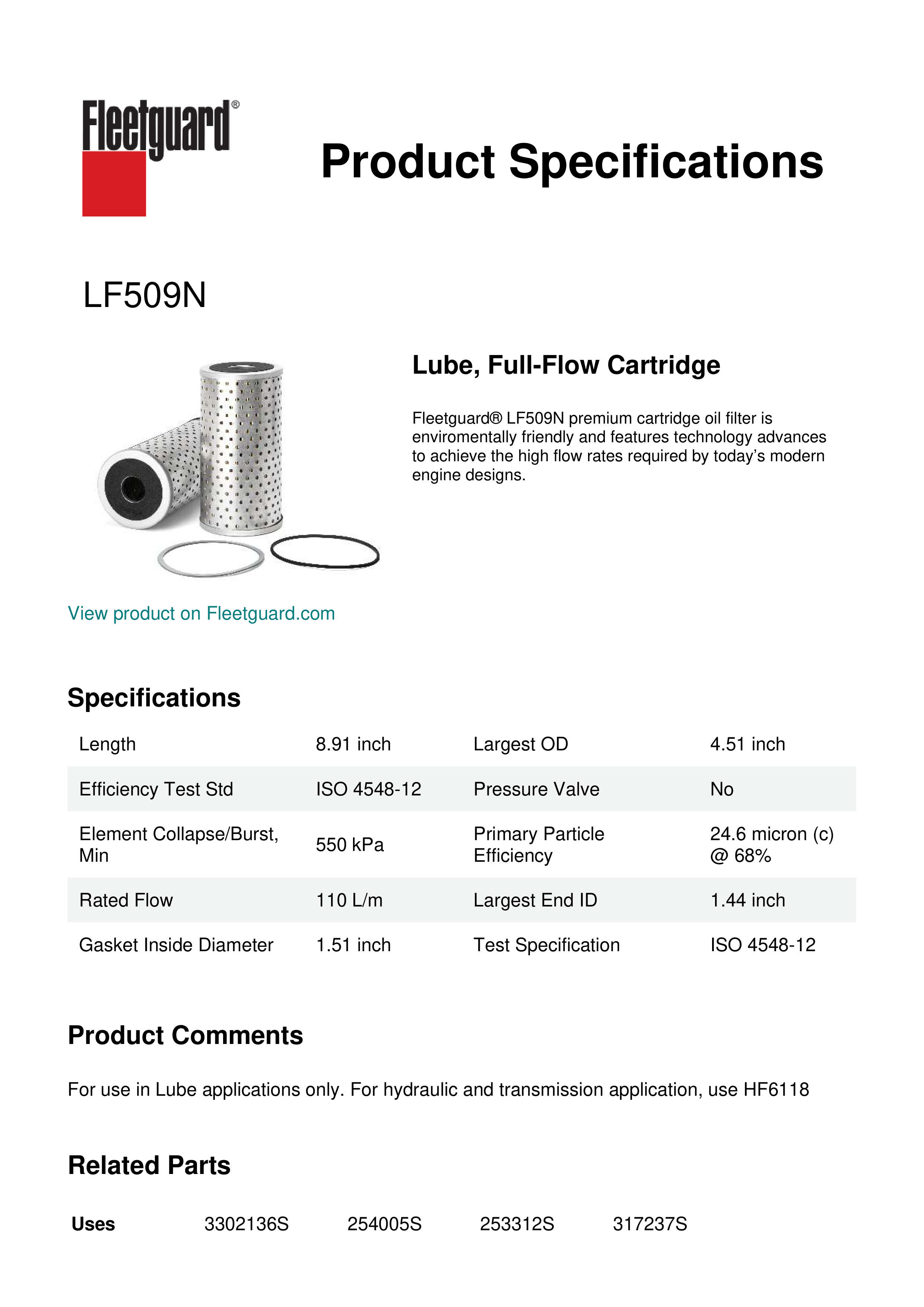 Fleetguard® LF509N premium cartridge oil filter is enviromentally friendly and features technology advances to achieve the high flow rates required by today’s modern engine designs.Specification