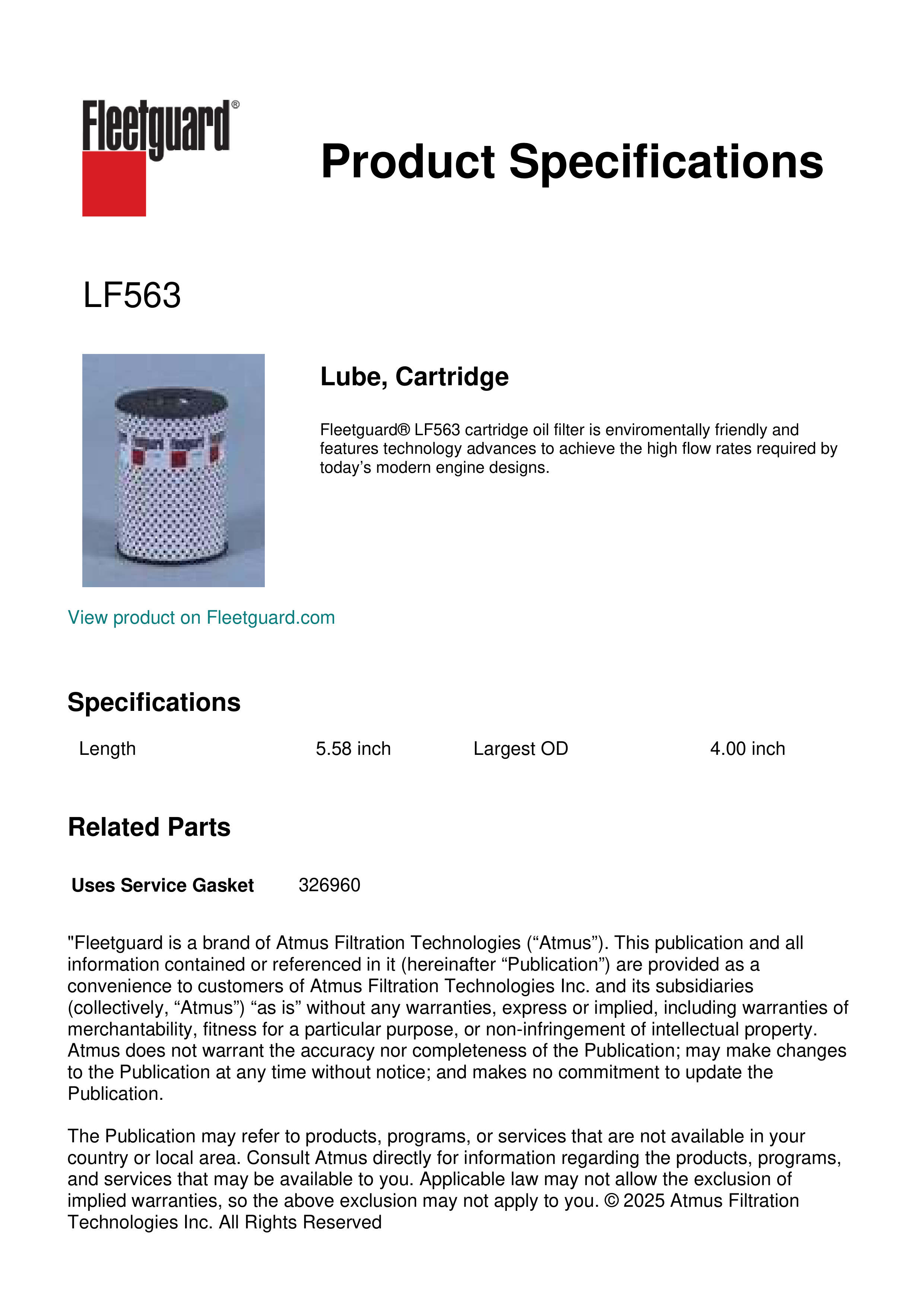Fleetguard® LF563 cartridge oil filter is enviromentally friendly and features technology advances to achieve the high flow rates required by today’s modern engine designs.Specification