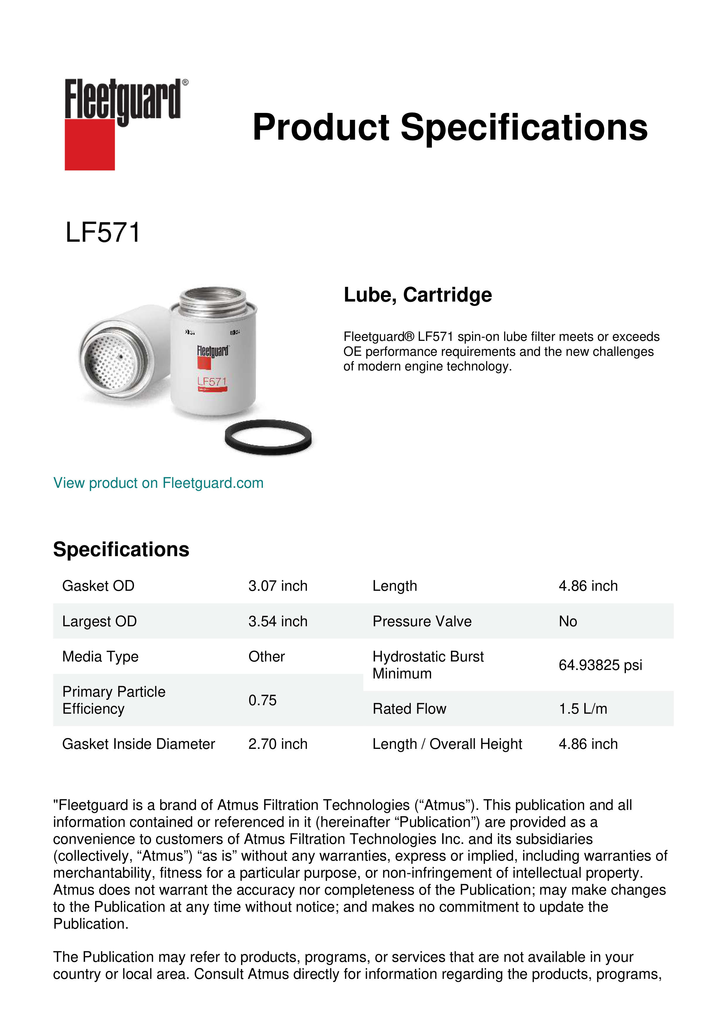 Fleetguard® LF571 spin-on lube filter meets or exceeds OE performance requirements and the new challenges of modern engine technology.Specification