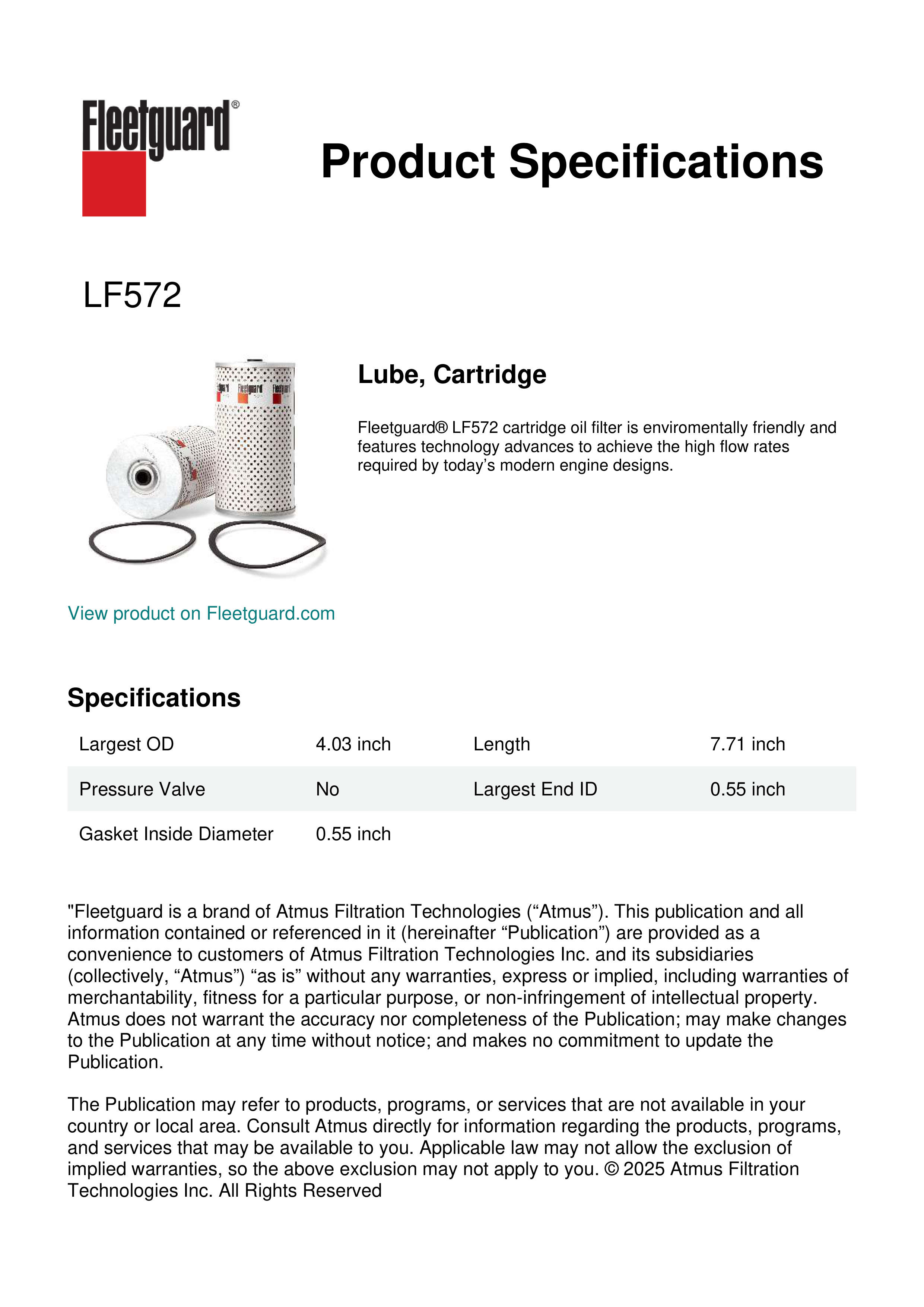 Fleetguard® LF572 cartridge oil filter is enviromentally friendly and features technology advances to achieve the high flow rates required by today’s modern engine designs.Specification