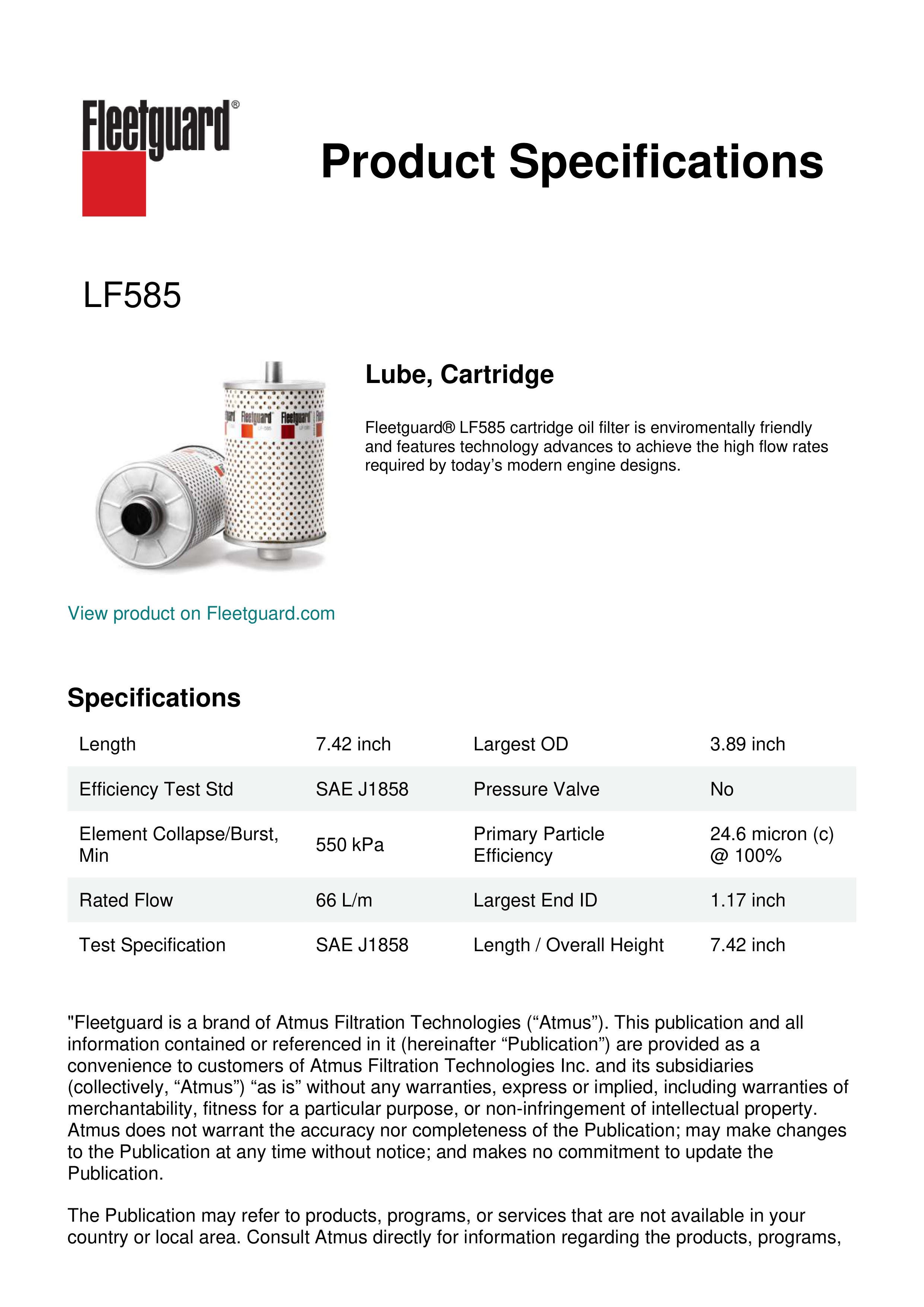 Fleetguard® LF585 cartridge oil filter is enviromentally friendly and features technology advances to achieve the high flow rates required by today’s modern engine designs.Specification