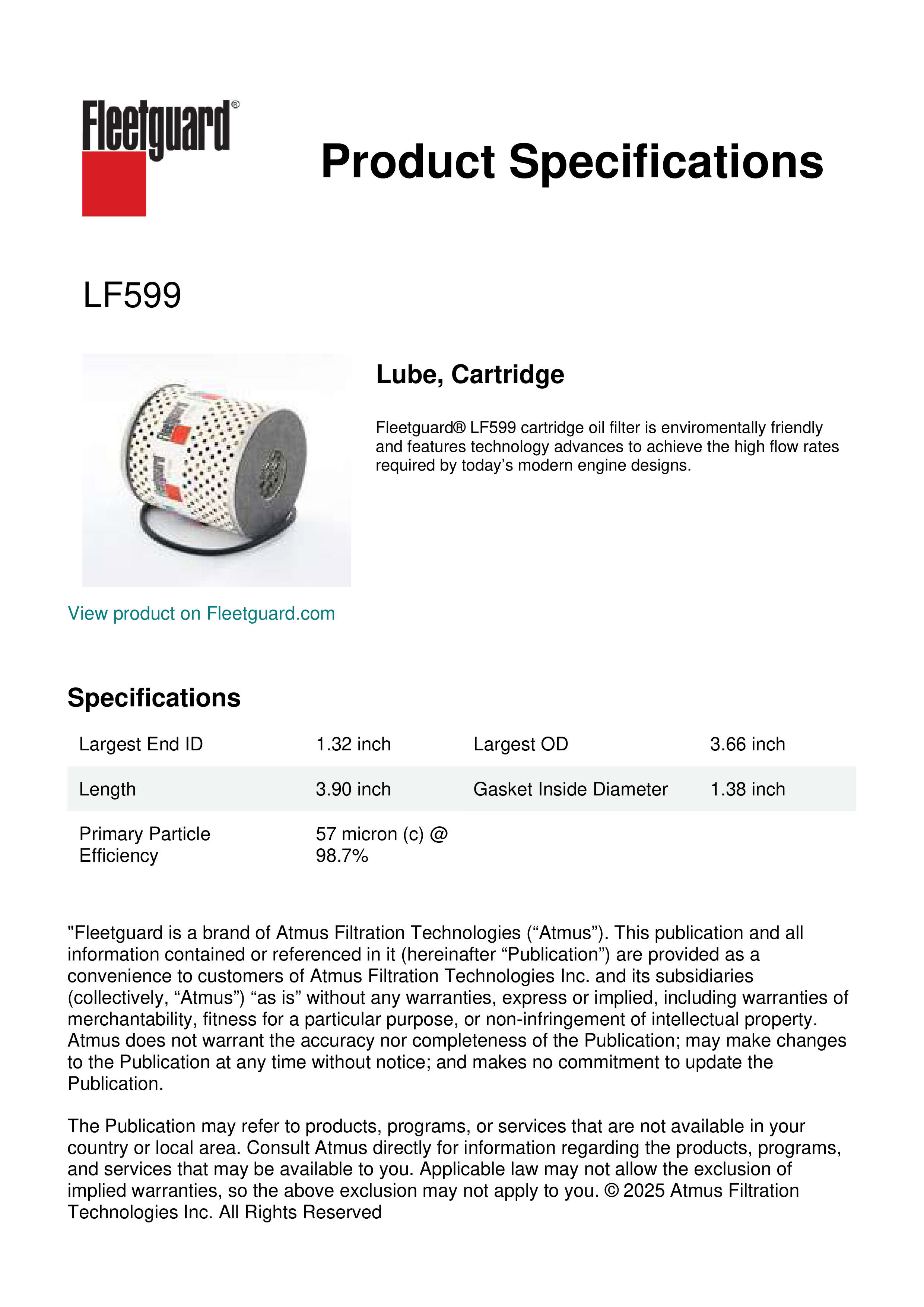 Fleetguard® LF599 cartridge oil filter is enviromentally friendly and features technology advances to achieve the high flow rates required by today’s modern engine designs.Specification
