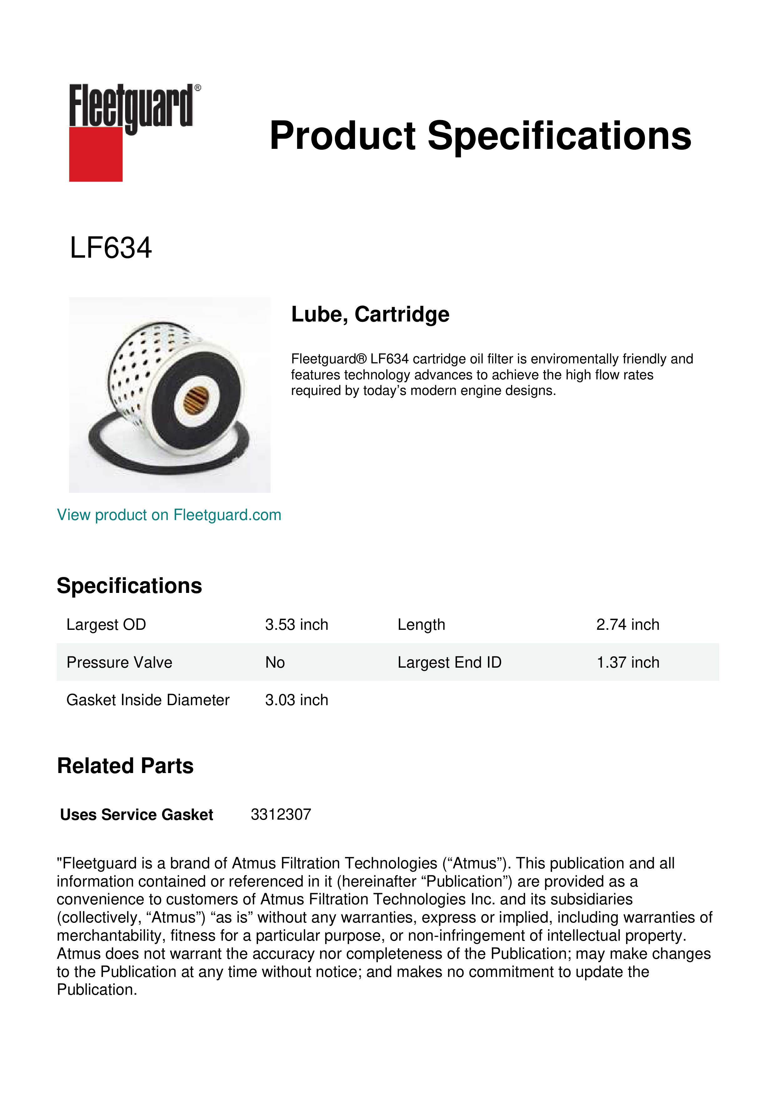 Fleetguard® LF634 cartridge oil filter is enviromentally friendly and features technology advances to achieve the high flow rates required by today’s modern engine designs.Specification