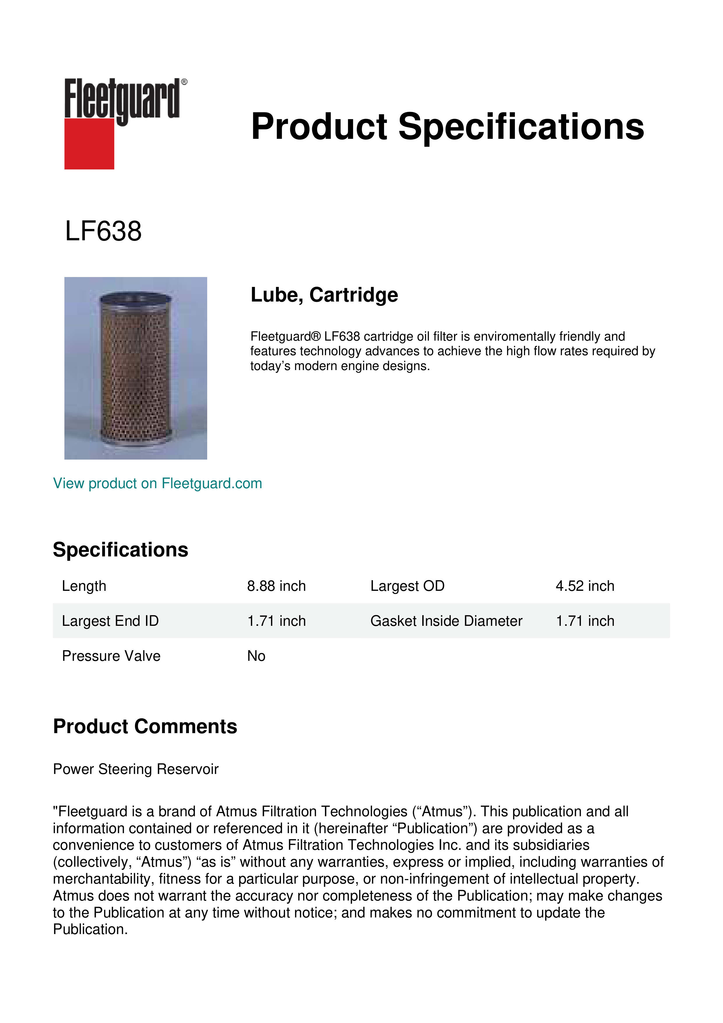 Fleetguard® LF638 cartridge oil filter is enviromentally friendly and features technology advances to achieve the high flow rates required by today’s modern engine designs.Specification
