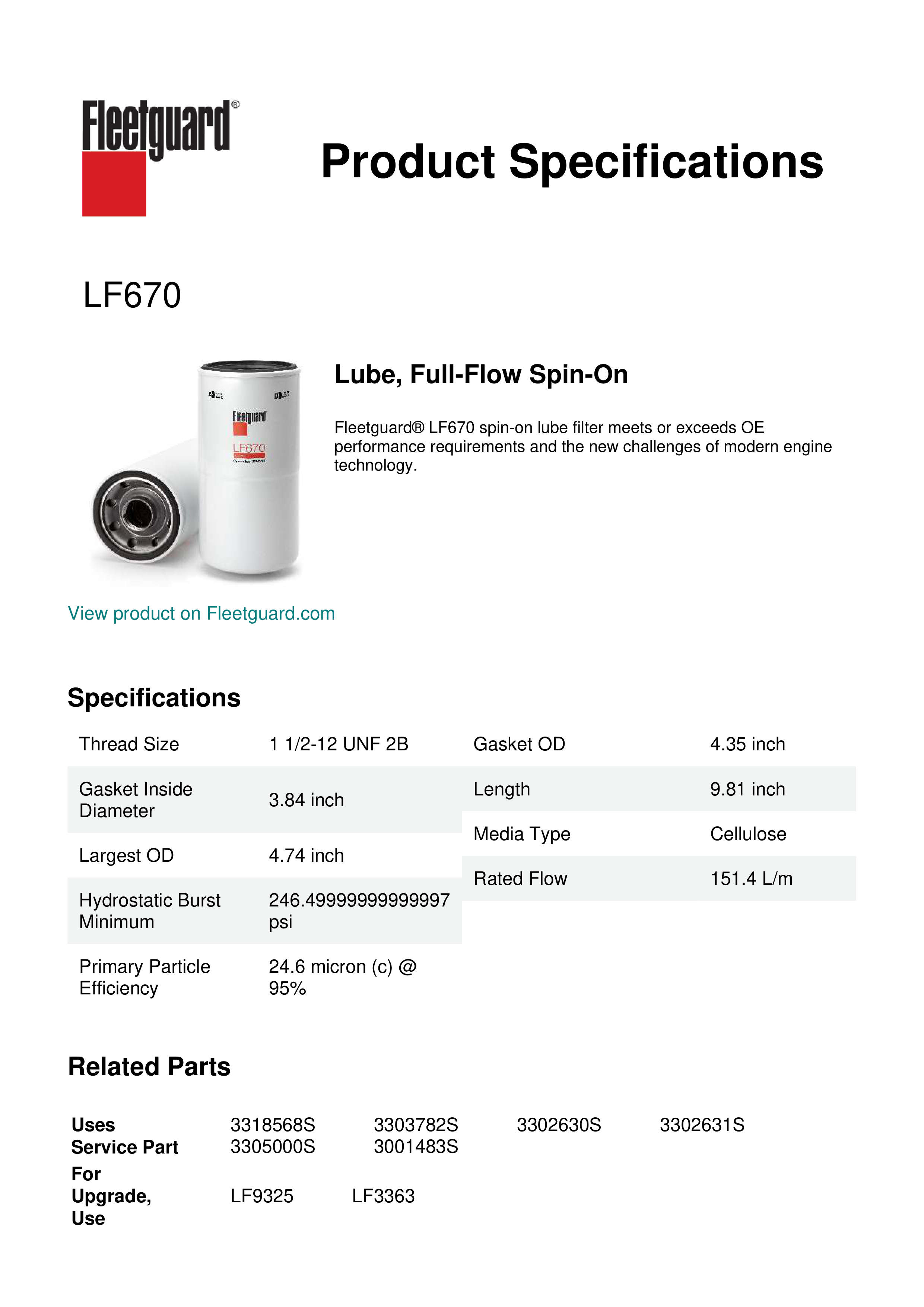 Fleetguard® LF670 spin-on lube filter meets or exceeds OE performance requirements and the new challenges of modern engine technology.Specification