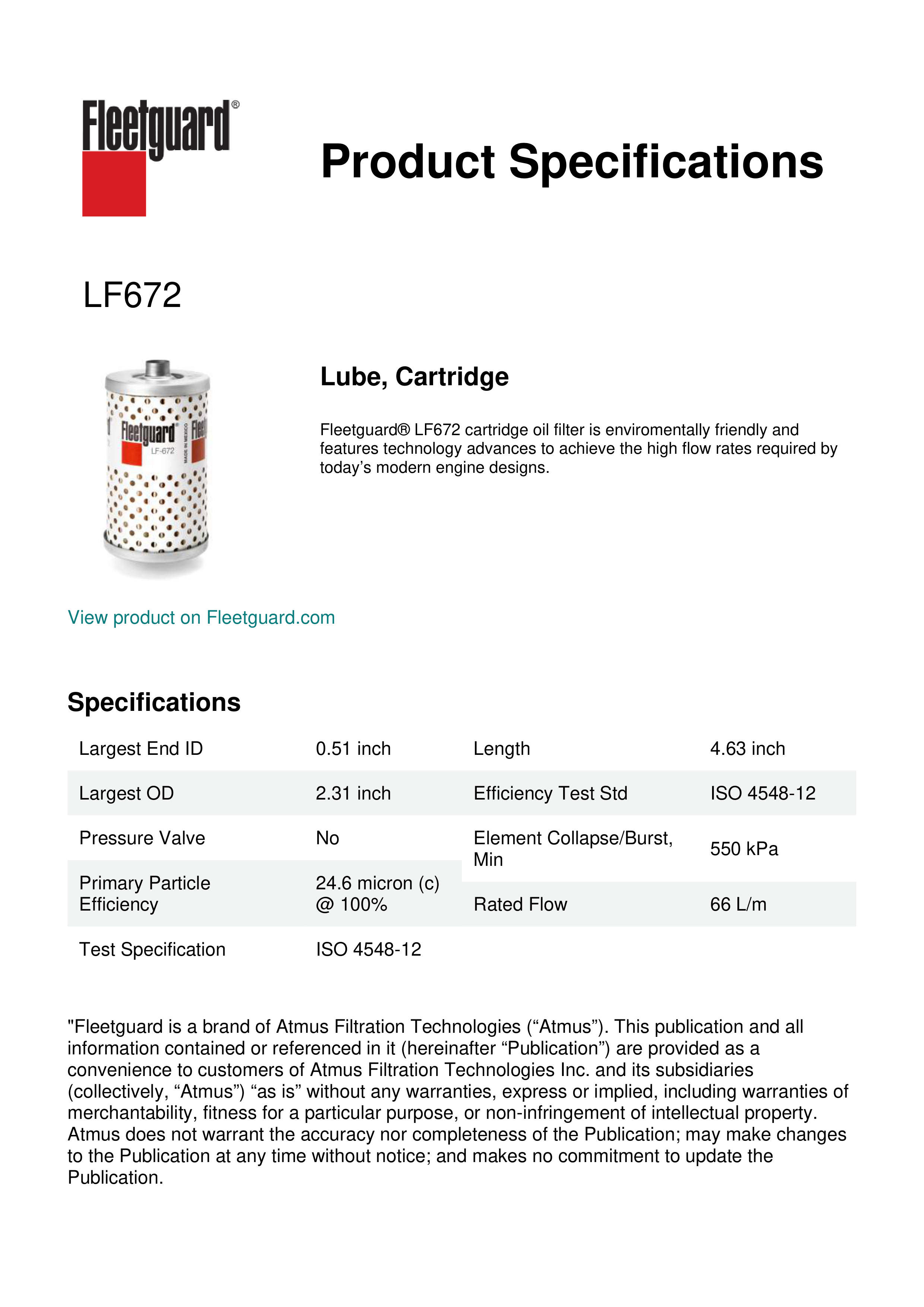 Fleetguard® LF672 cartridge oil filter is enviromentally friendly and features technology advances to achieve the high flow rates required by today’s modern engine designs.Specification