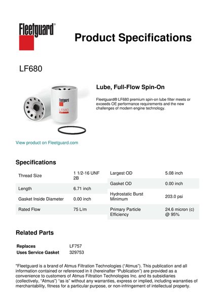Fleetguard® LF680 premium spin-on lube filter meets or exceeds OE performance requirements and the new challenges of modern engine technology.Specification