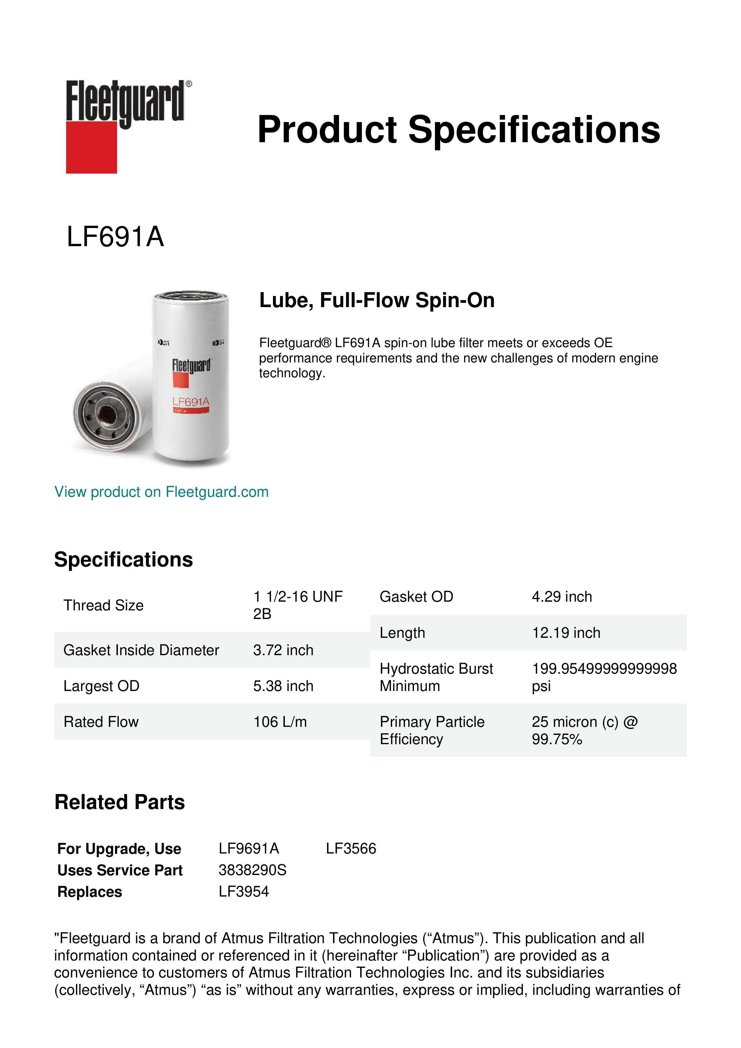Fleetguard® LF691A spin-on lube filter meets or exceeds OE performance requirements and the new challenges of modern engine technology.Specification