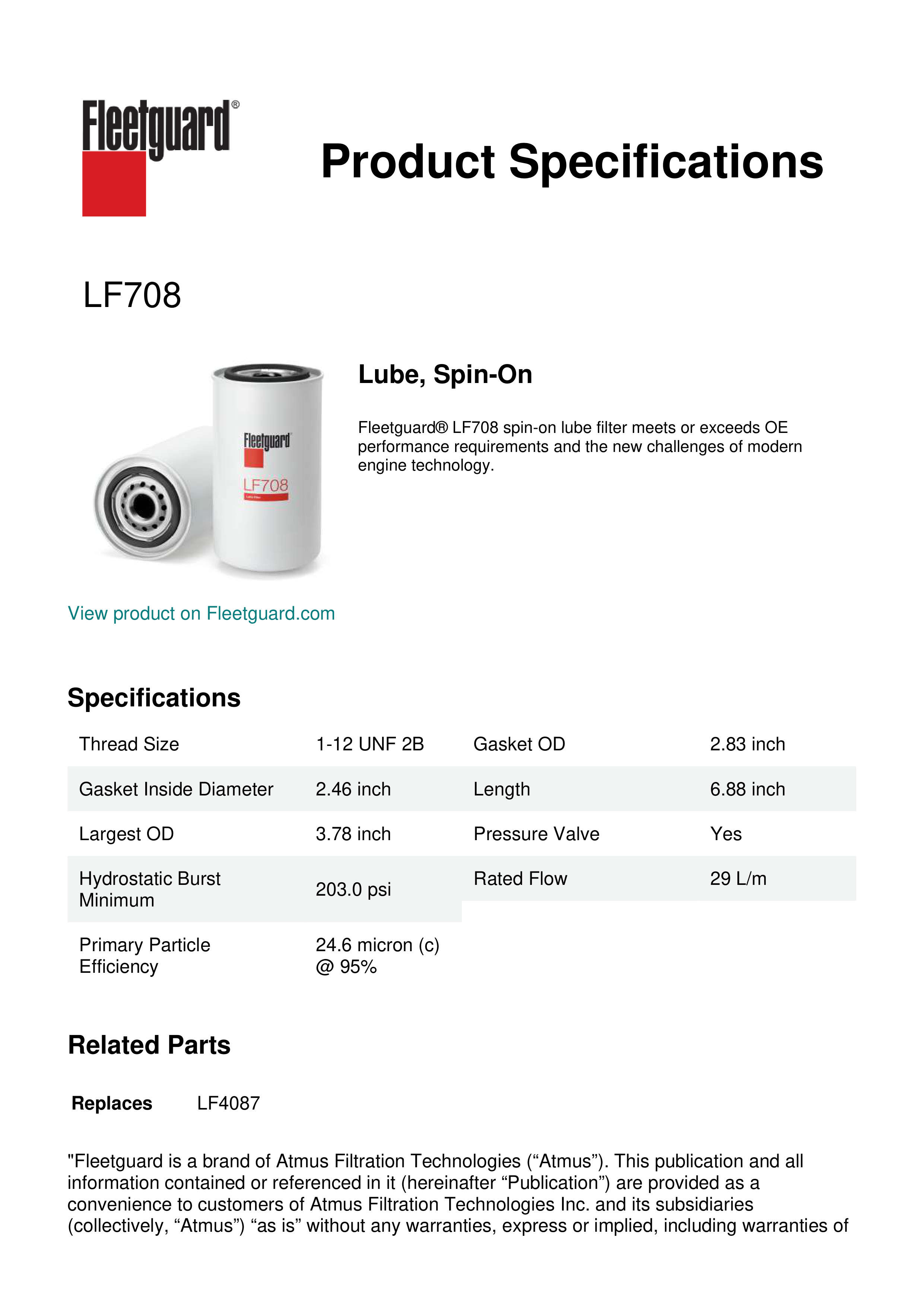 Fleetguard® LF708 spin-on lube filter meets or exceeds OE performance requirements and the new challenges of modern engine technology.Specification