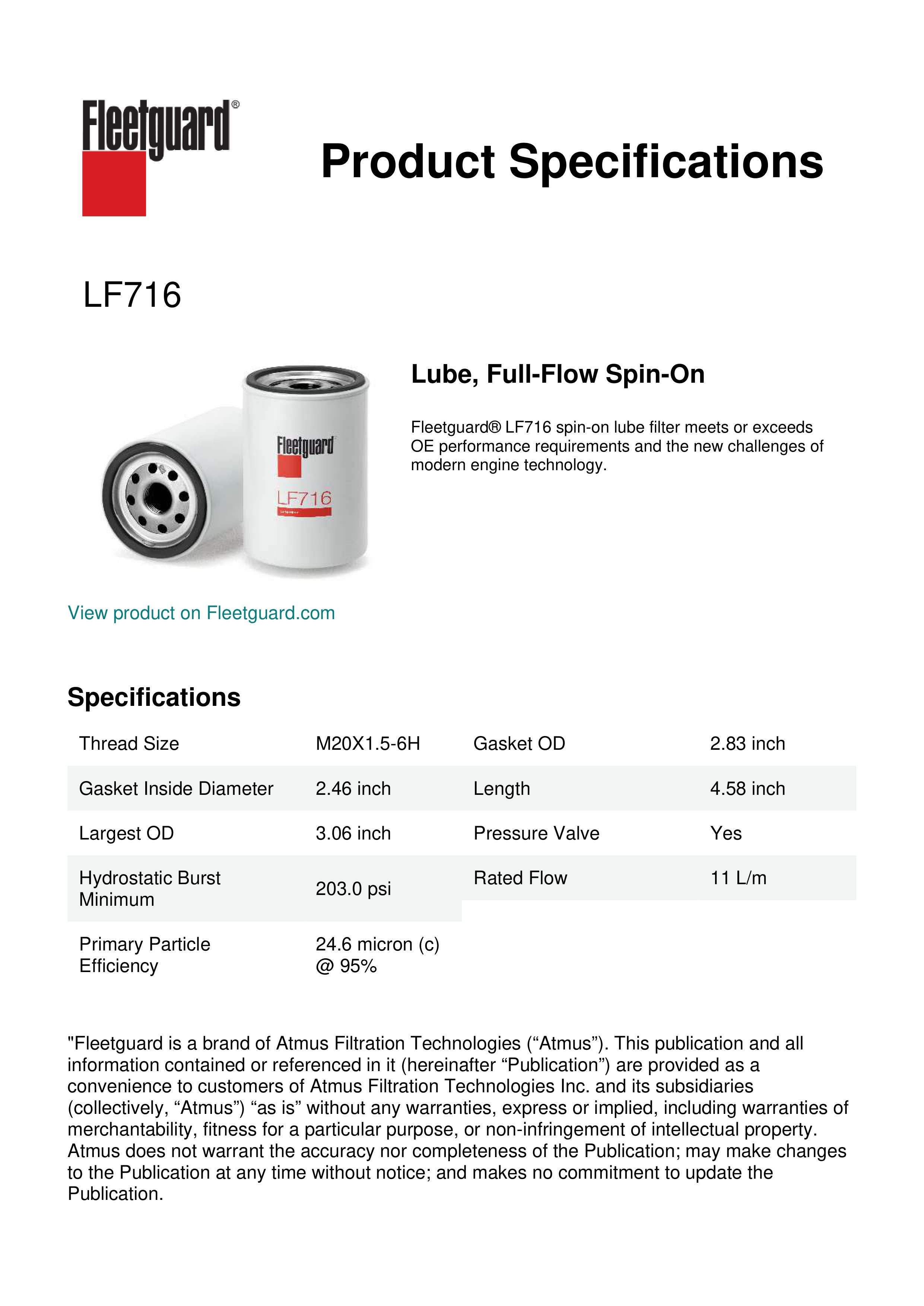 Fleetguard® LF716 spin-on lube filter meets or exceeds OE performance requirements and the new challenges of modern engine technology.Specification