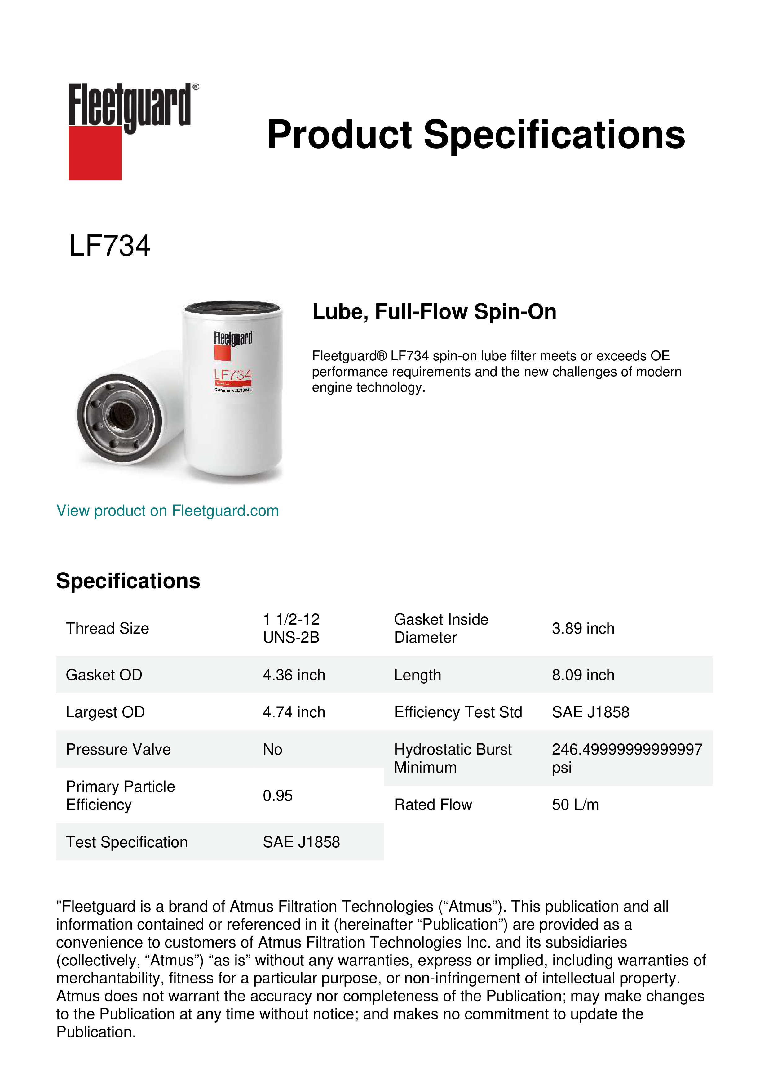 Fleetguard® LF734 spin-on lube filter meets or exceeds OE performance requirements and the new challenges of modern engine technology.Specification