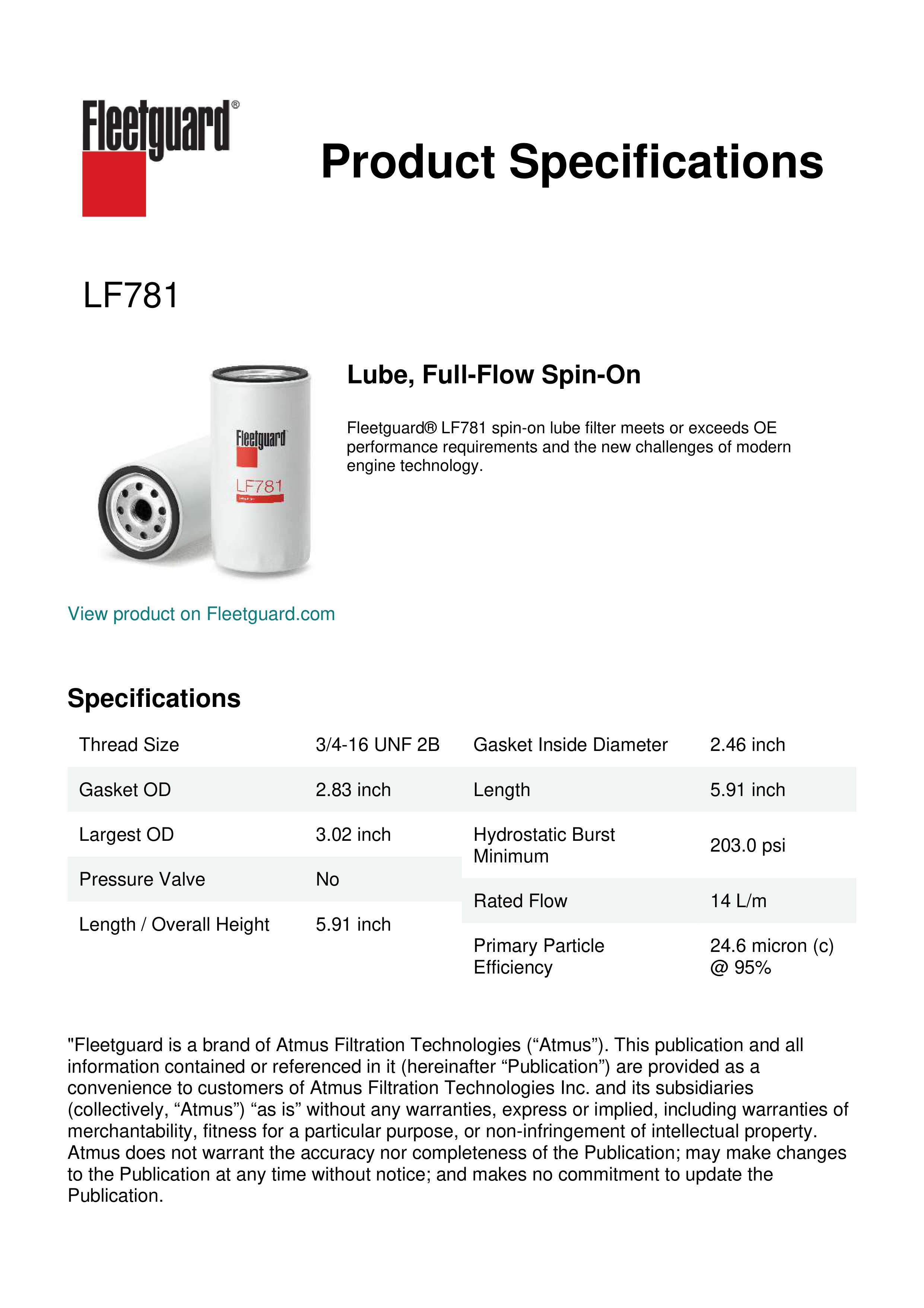 Fleetguard® LF781 spin-on lube filter meets or exceeds OE performance requirements and the new challenges of modern engine technology.Specification