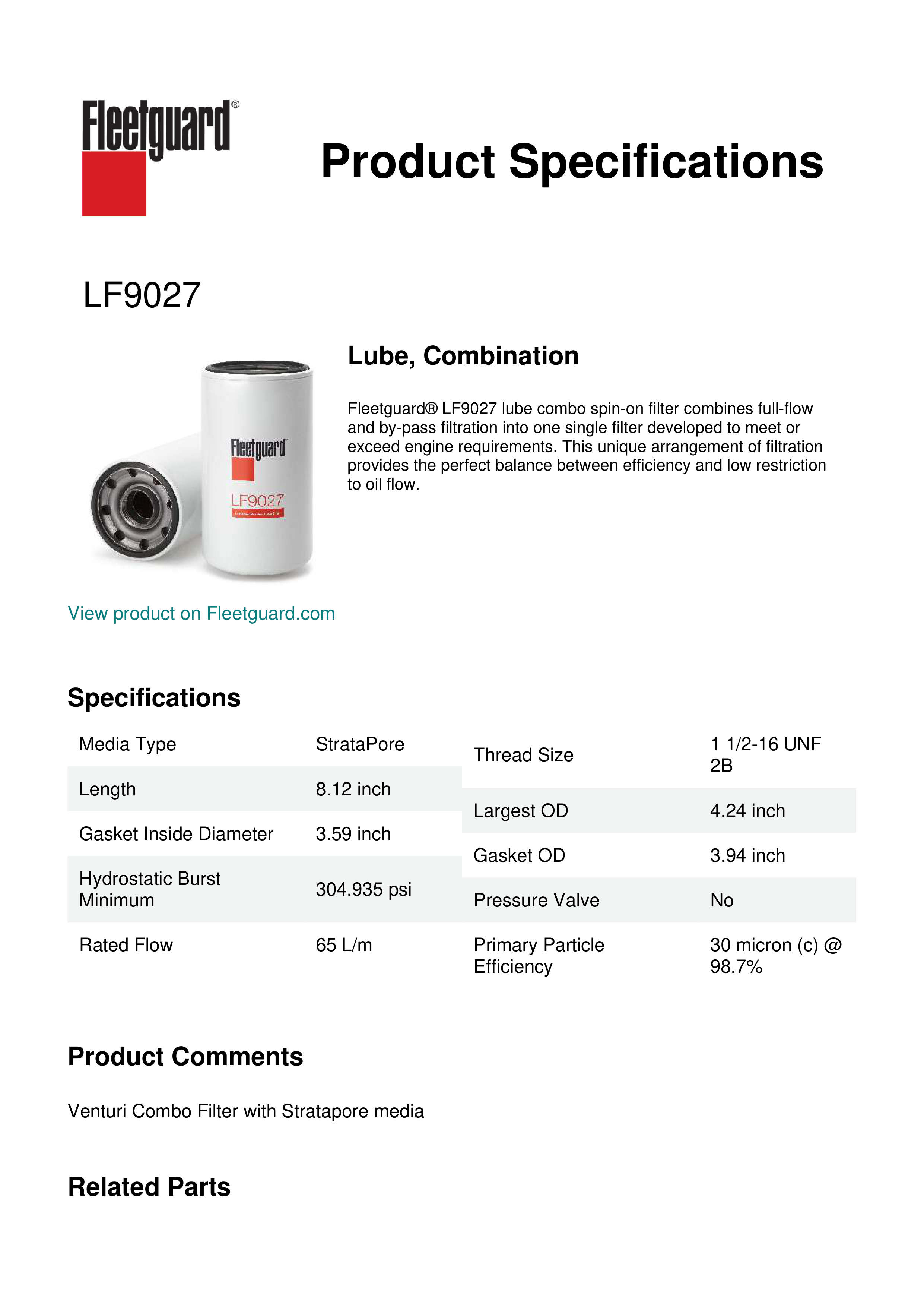 Fleetguard® LF9027 lube combo spin-on filter combines full-flow and by-pass filtration into one single filter developed to meet or exceed engine requirements. This unique arrangement of filtration provides the perfect balance between efficiency and low restriction to oil flow.Specification