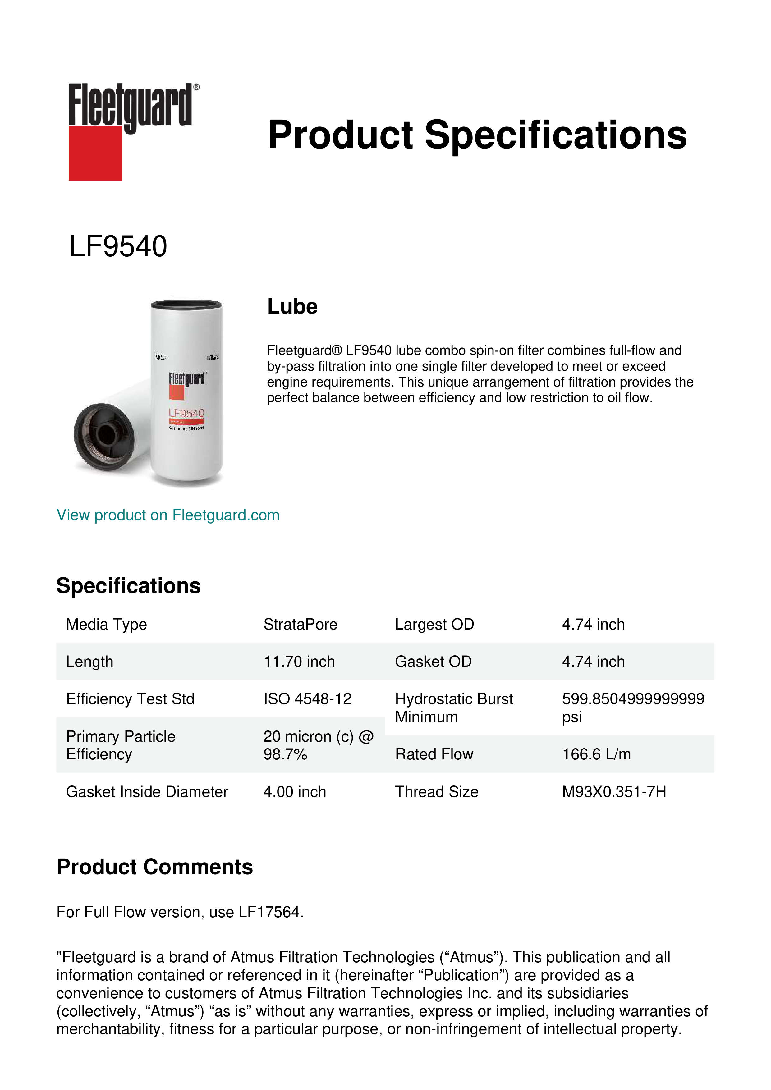 Fleetguard® LF9540 lube combo spin-on filter combines full-flow and by-pass filtration into one single filter developed to meet or exceed engine requirements. This unique arrangement of filtration provides the perfect balance between efficiency and low restriction to oil flow.Specification