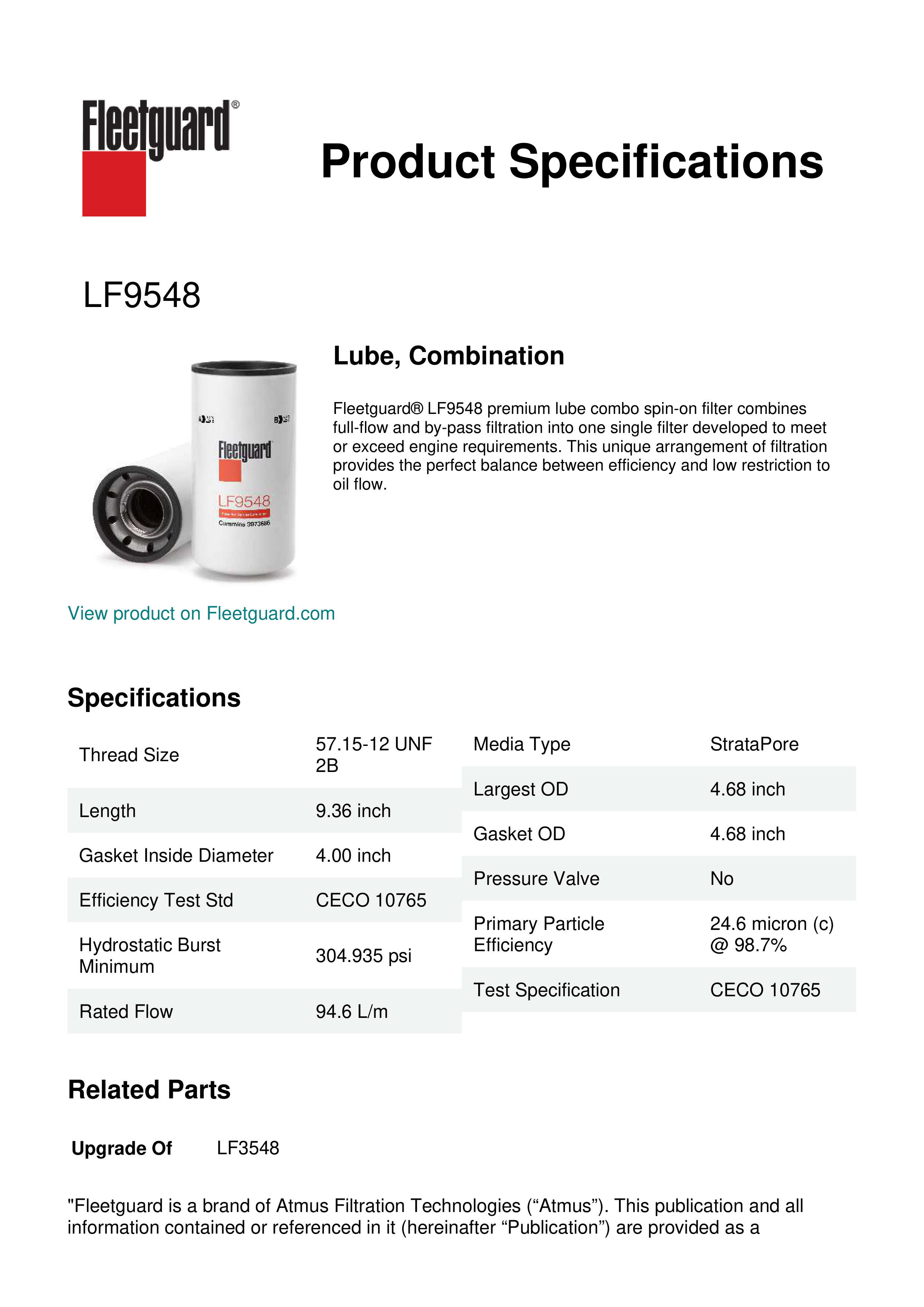 Fleetguard® LF9548 premium lube combo spin-on filter combines full-flow and by-pass filtration into one single filter developed to meet or exceed engine requirements. This unique arrangement of filtration provides the perfect balance between efficiency and low restriction to oil flow.Specification