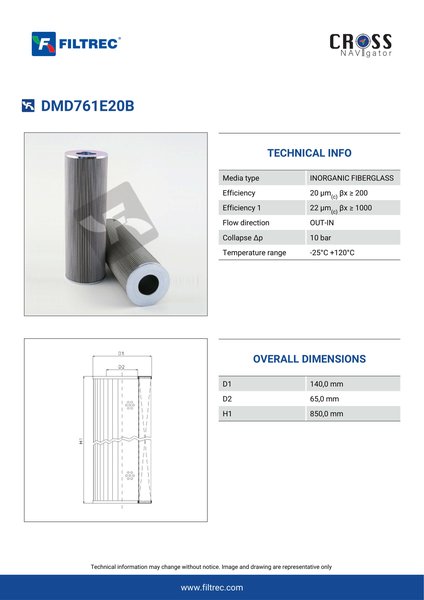 Genuine Filtrec DMD761E20B. This Filtrec element is designed to meet or exceed the quality and performance of brand OEM’s ensuring superior filtration performance and long-lasting durability.
