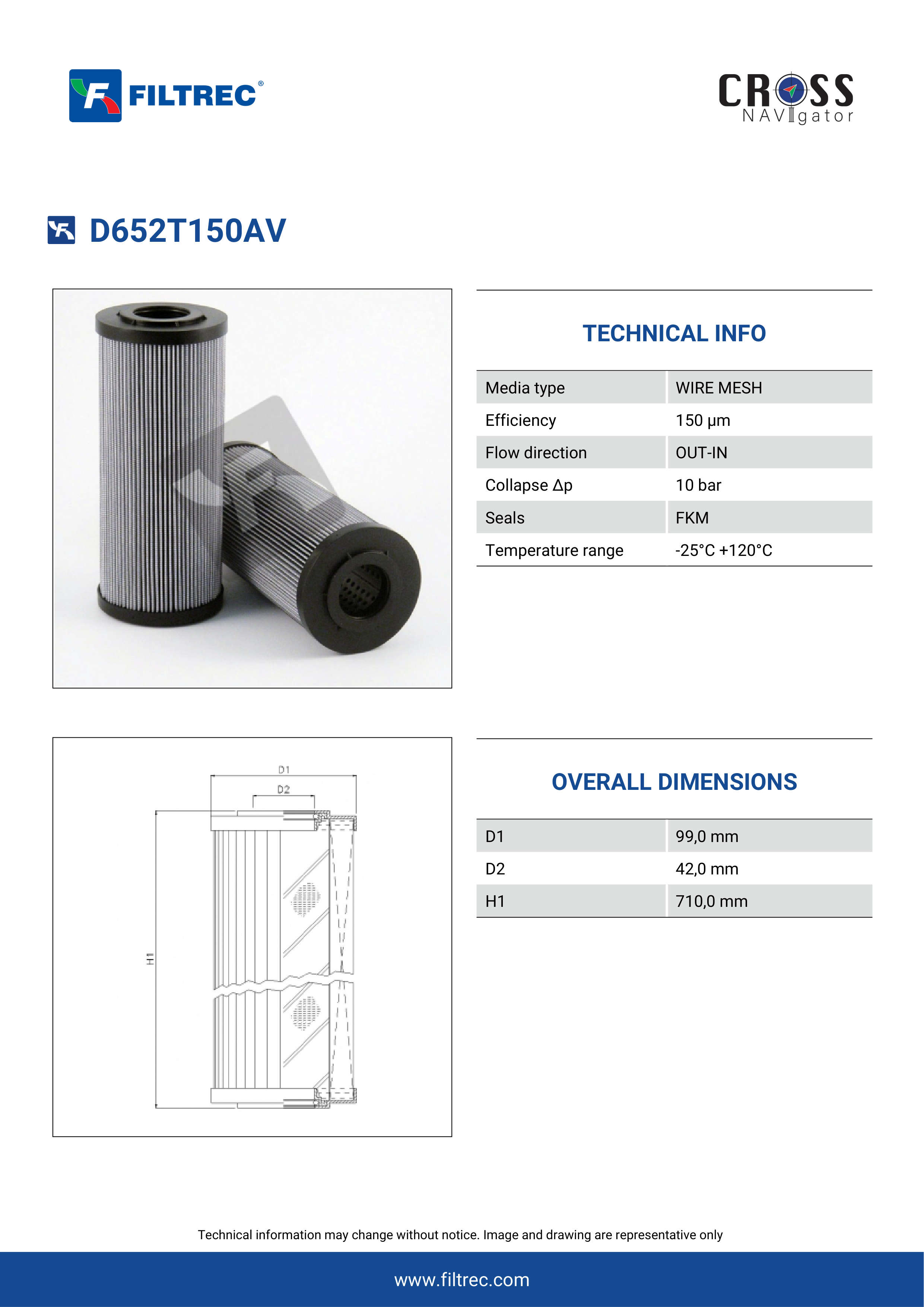 Genuine Filtrec D652T150AV. This Filtrec element is designed to meet or exceed the quality and performance of brand OEM’s ensuring superior filtration performance and long-lasting durability.