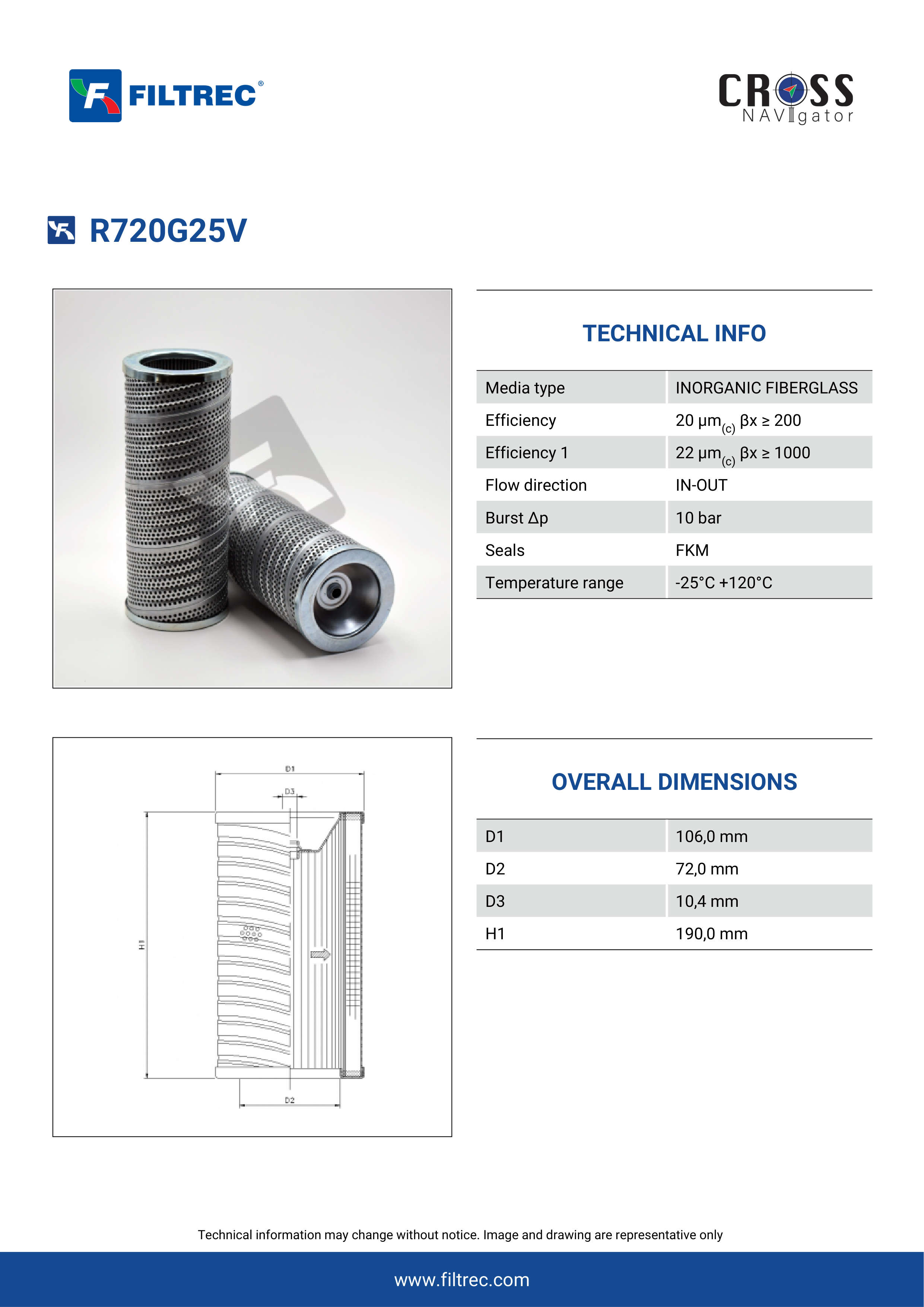 Genuine Filtrec R720G25V. This Filtrec element is designed to meet or exceed the quality and performance of brand OEM’s ensuring superior filtration performance and long-lasting durability.Engineered with their high performance media and a durable design, the R720G25V provides reliable and consistent performance over its lifespan, even in harsh operating environments. When you order from FilterFinder, you can trust that you are getting a reliable and high-quality replacement filter that will keep your system running smoothly.
