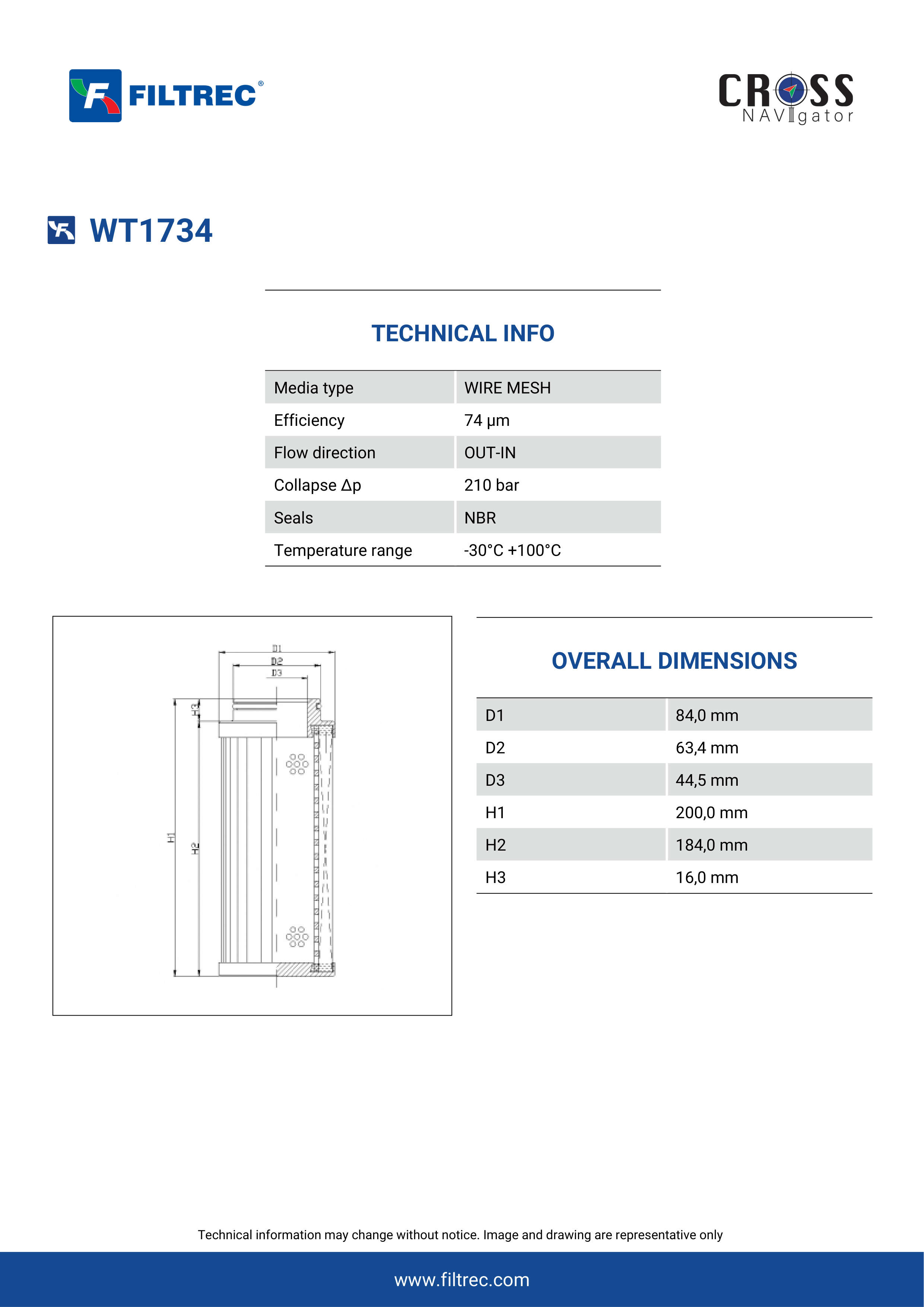 Genuine Filtrec WT1734. This Filtrec element is designed to meet or exceed the quality and performance of brand OEM’s ensuring superior filtration performance and long-lasting durability.