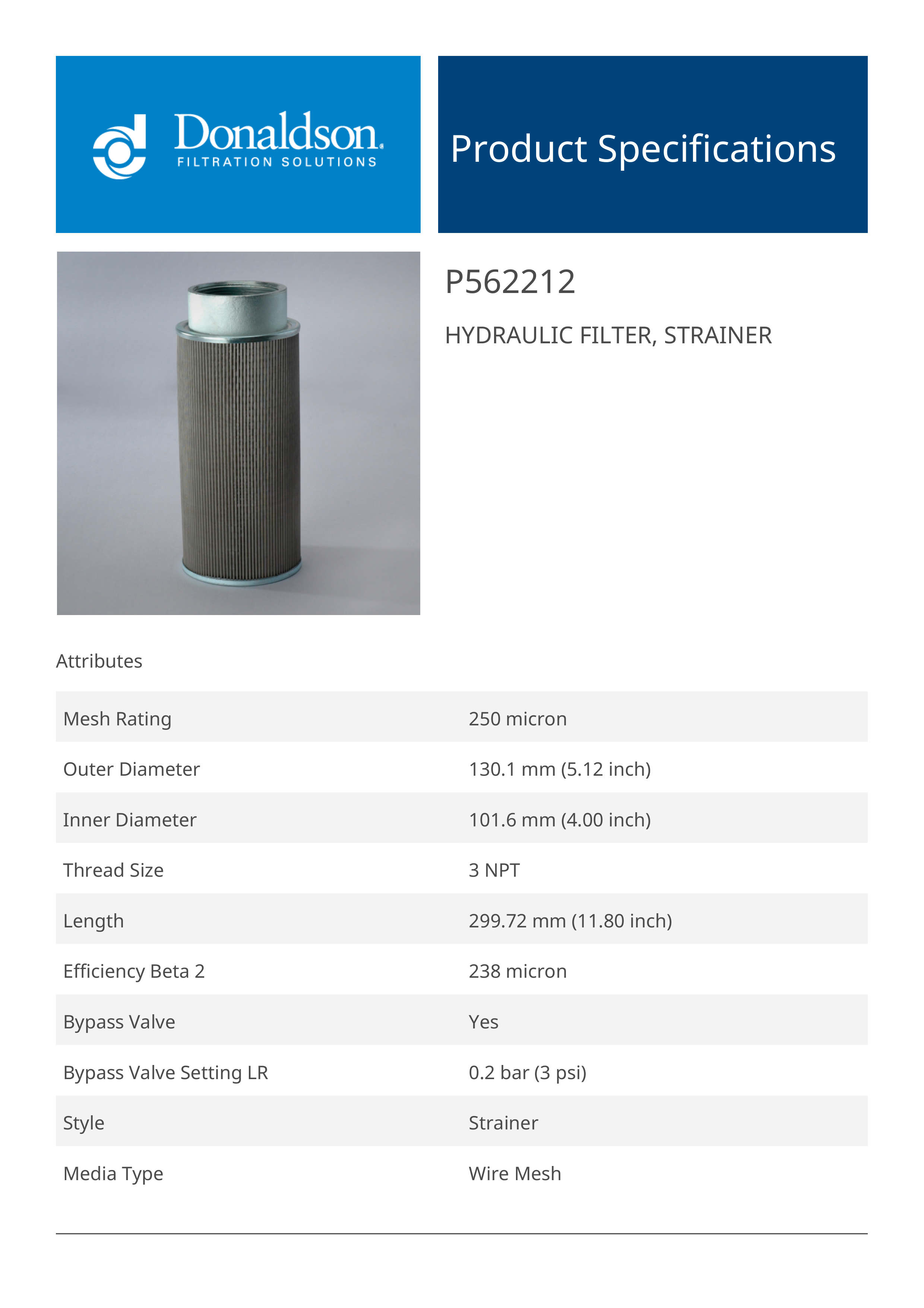 Genuine Donaldson P562212 Hydraulic Filter, Strainer is designed to capture larger contaminants before they enter the hydraulic system, protecting sensitive components from damage. Its coarse filtration capability helps extend the life of downstream filters and improves overall system performance.Ideal for low-pressure applications, this strainer offers durable construction and easy installation. It’s a cost-effective solution for maintaining hydraulic fluid cleanliness and preventing clogging in pumps and valves.