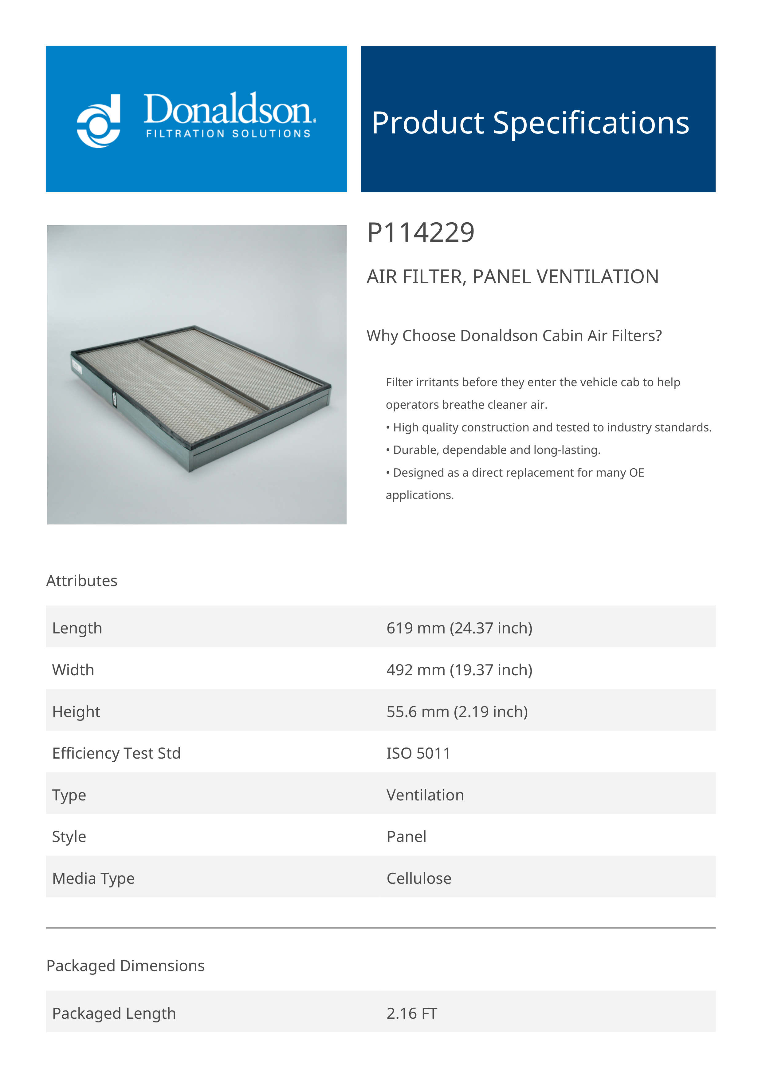 Donaldson P114229 Air Panel, Ventilation