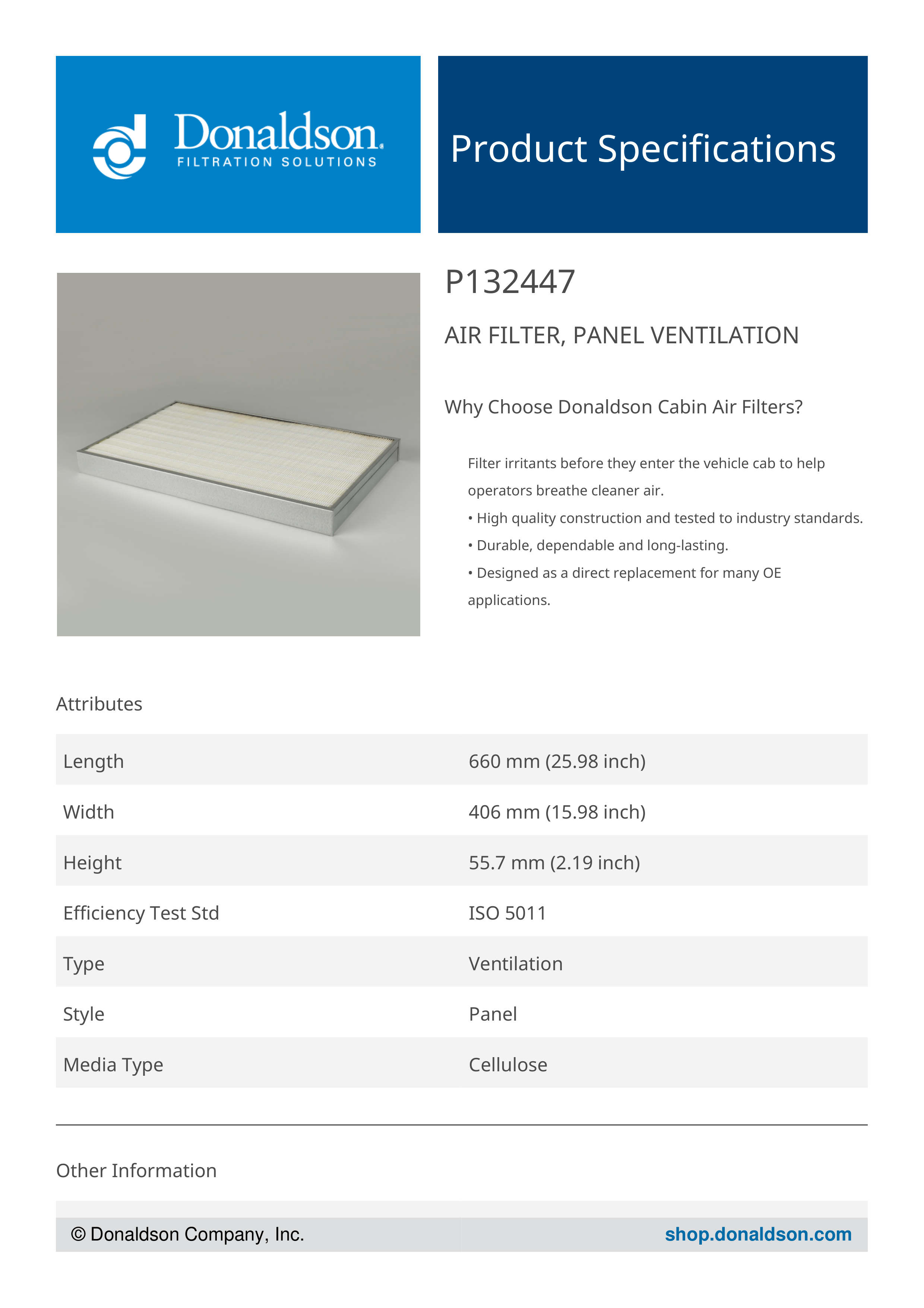 Genuine Donaldson P132447 Air Panel, Ventilation is designed to provide reliable performance in air panel, ventilation applications. Built with high-quality materials, it ensures consistent functionality and durability.