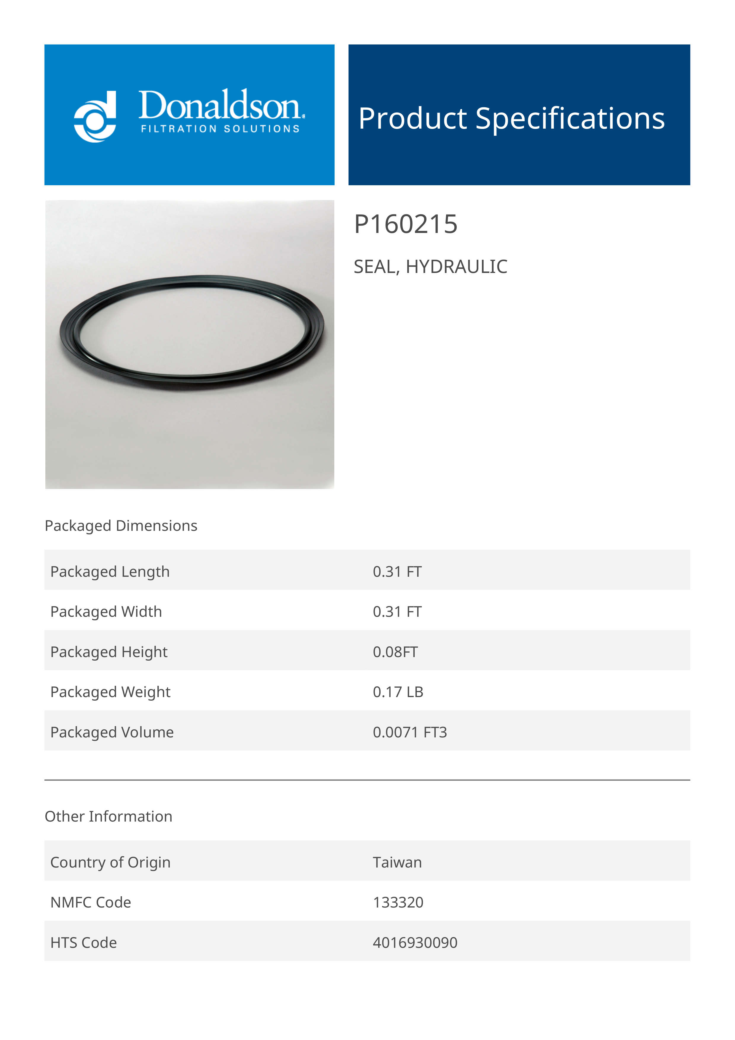 Donaldson P160215 Hydraulic Seal
