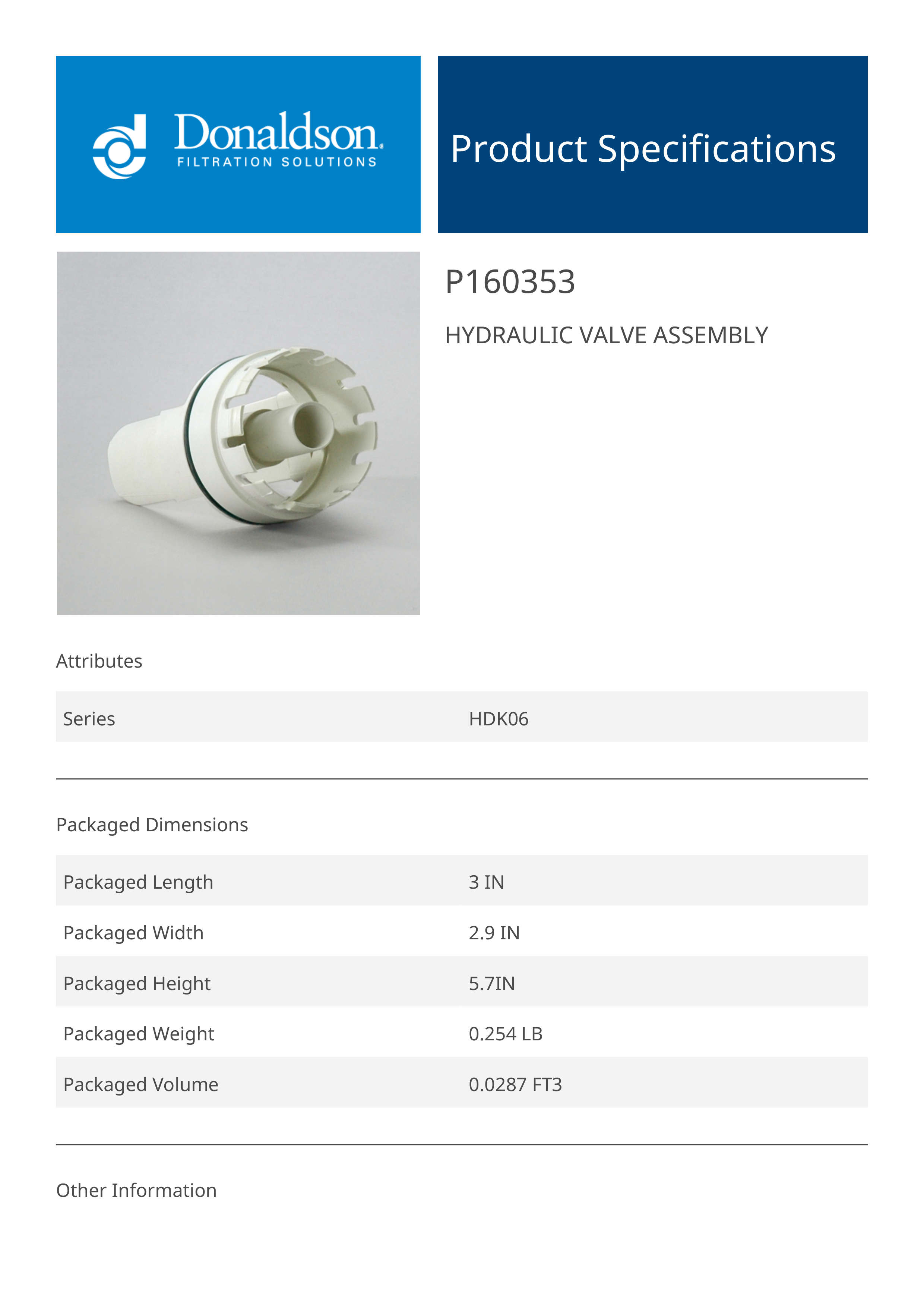 Donaldson P160353 Hydraulic Valve Assy
