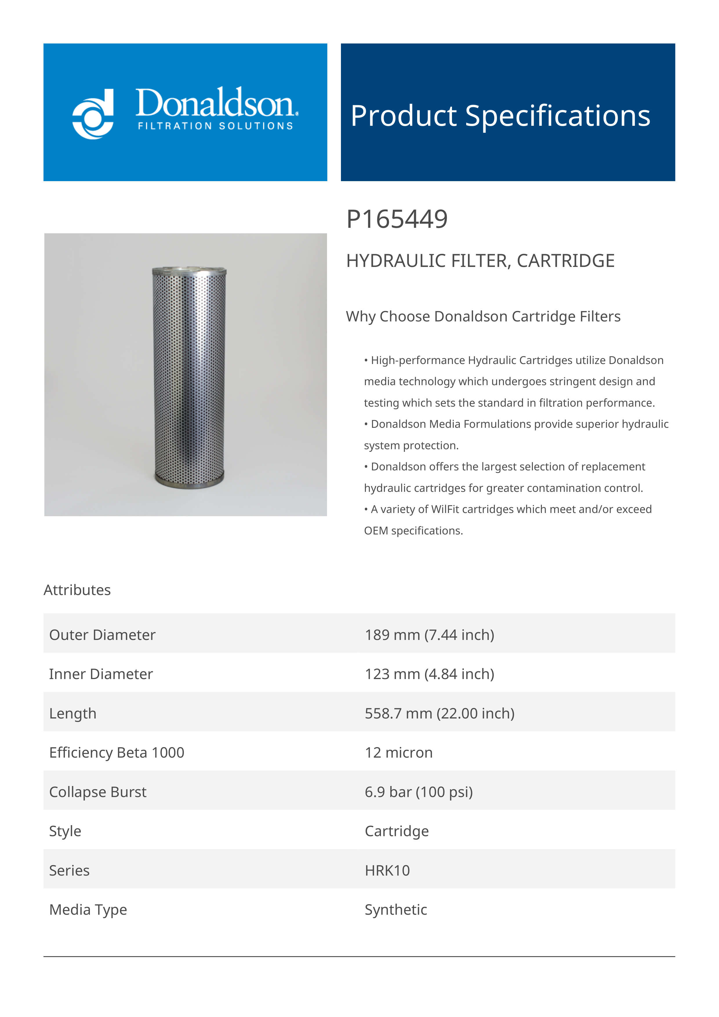 Genuine Donaldson P165449 Hydraulic Cartridge offers superior filtration performance, effectively removing contaminants from hydraulic fluids. Its high-capacity design helps maintain fluid cleanliness and system efficiency.