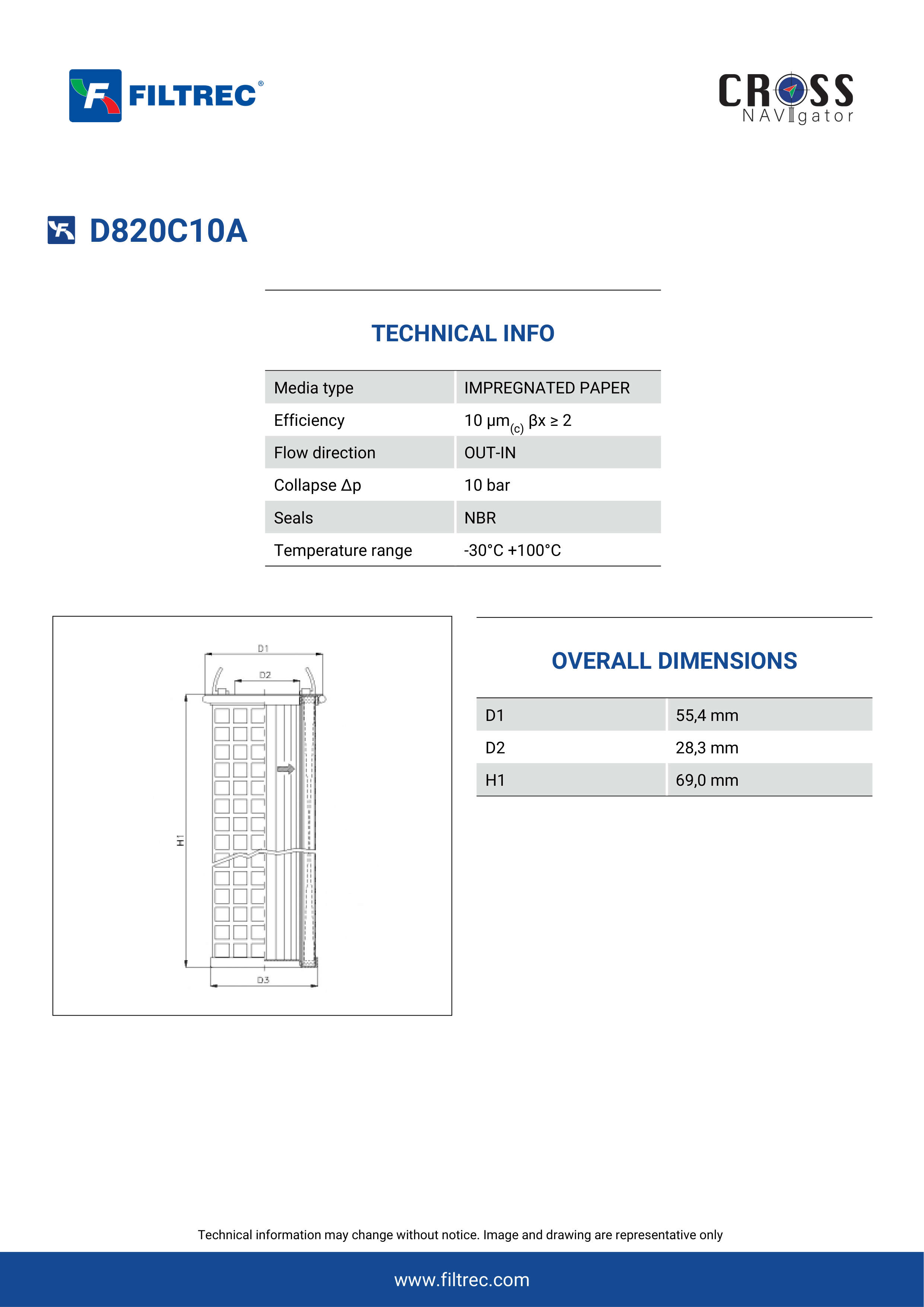The efficiency of the element is shown using the Micron (µ) and Beta (β) ratings. The micron rating indicates the size of the particle being filtered and the beta rating the efficiency, calculated as 1/β.
