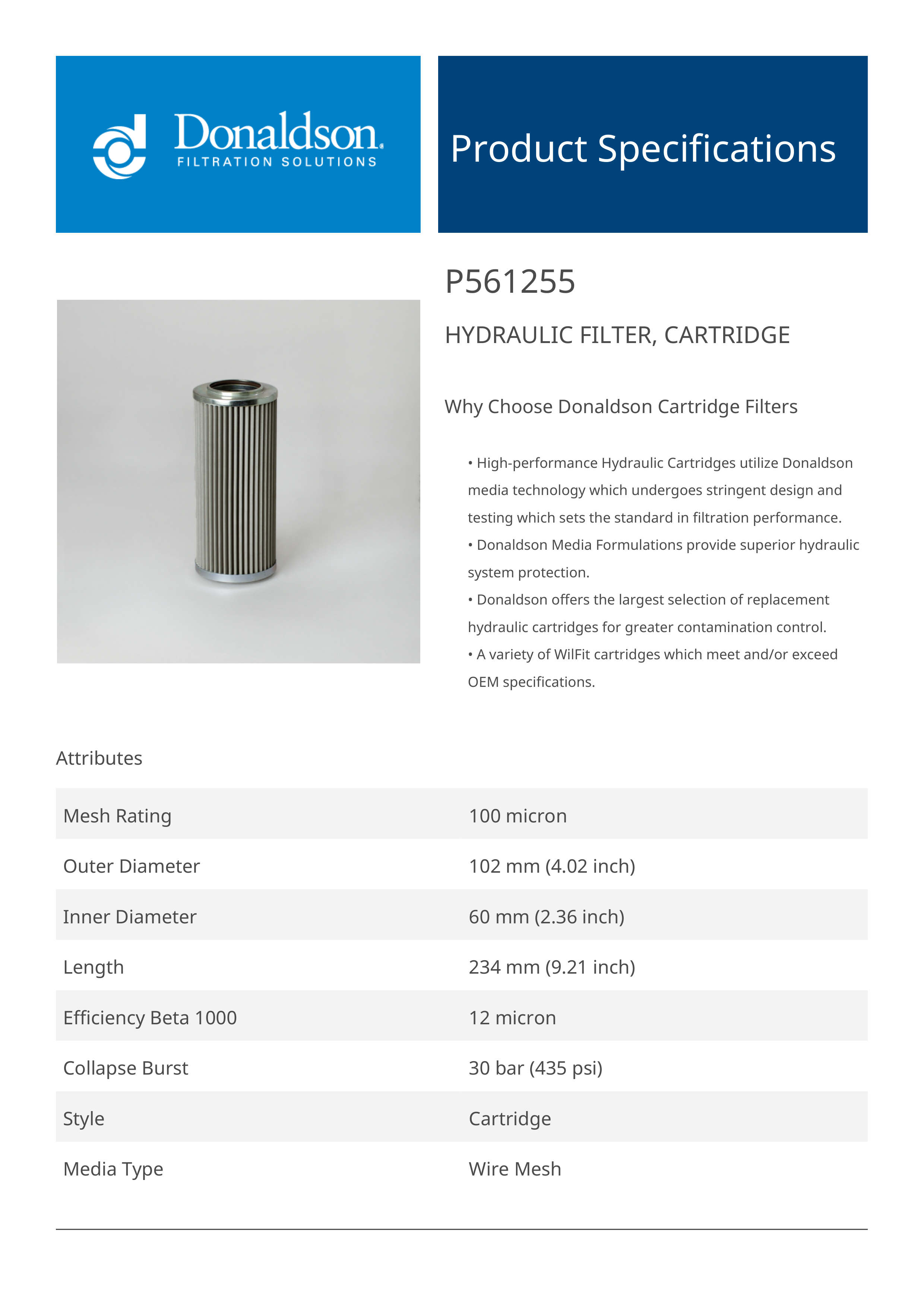 Genuine Donaldson P561255 Hydraulic Cartridge offers superior filtration performance, effectively removing contaminants from hydraulic fluids. Its high-capacity design helps maintain fluid cleanliness and system efficiency.