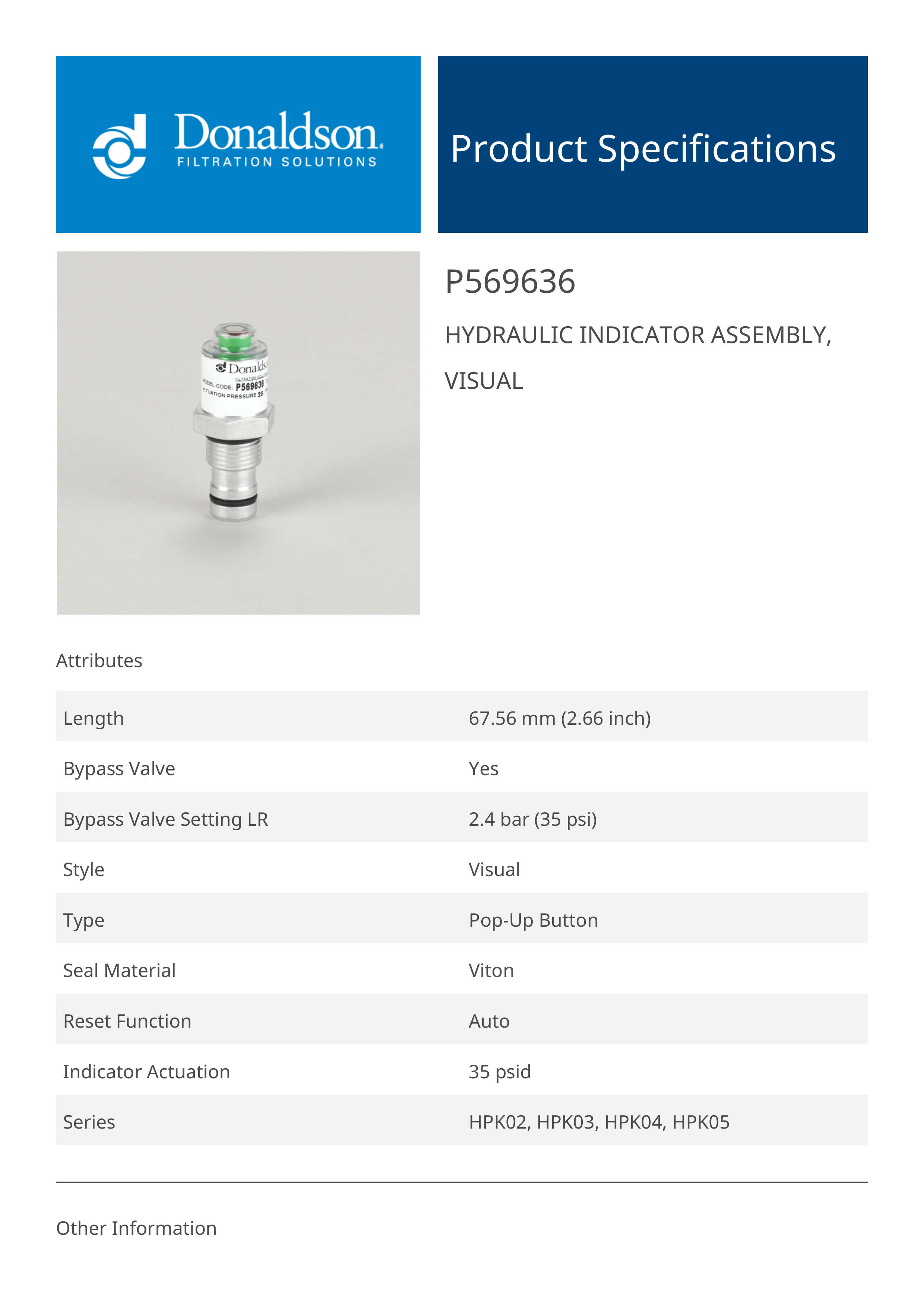 Donaldson P569636 Hydraulic Indicator Assembly Visual