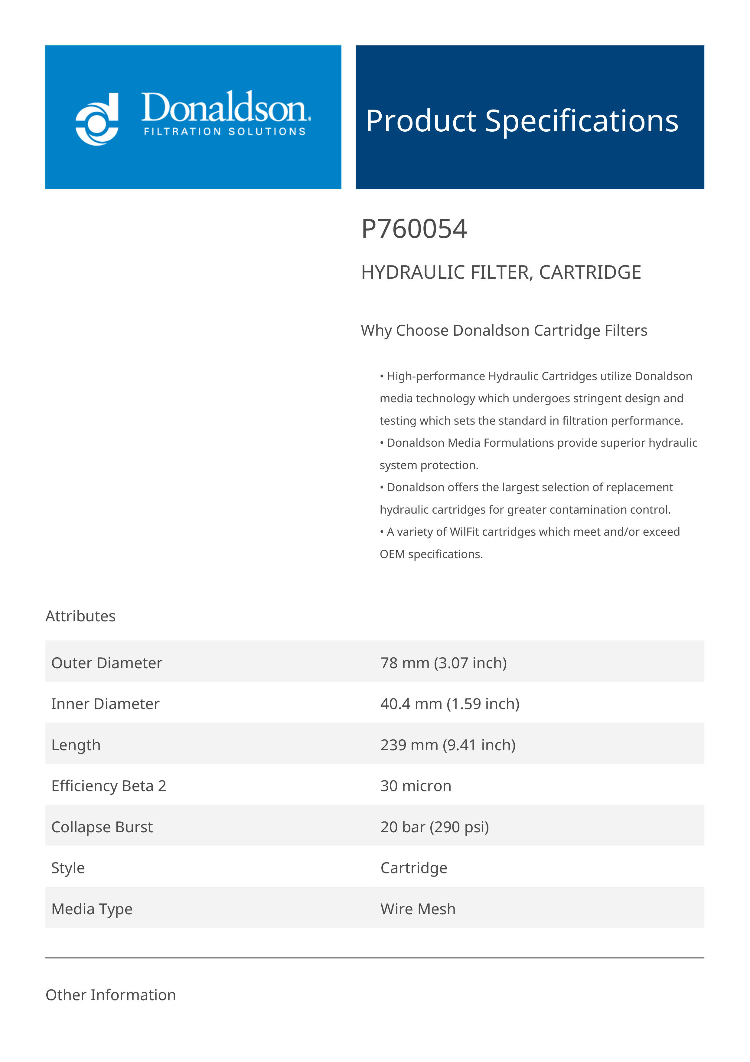 Genuine Donaldson P760054 Hydraulic Cartridge offers superior filtration performance, effectively removing contaminants from hydraulic fluids. Its high-capacity design helps maintain fluid cleanliness and system efficiency.
