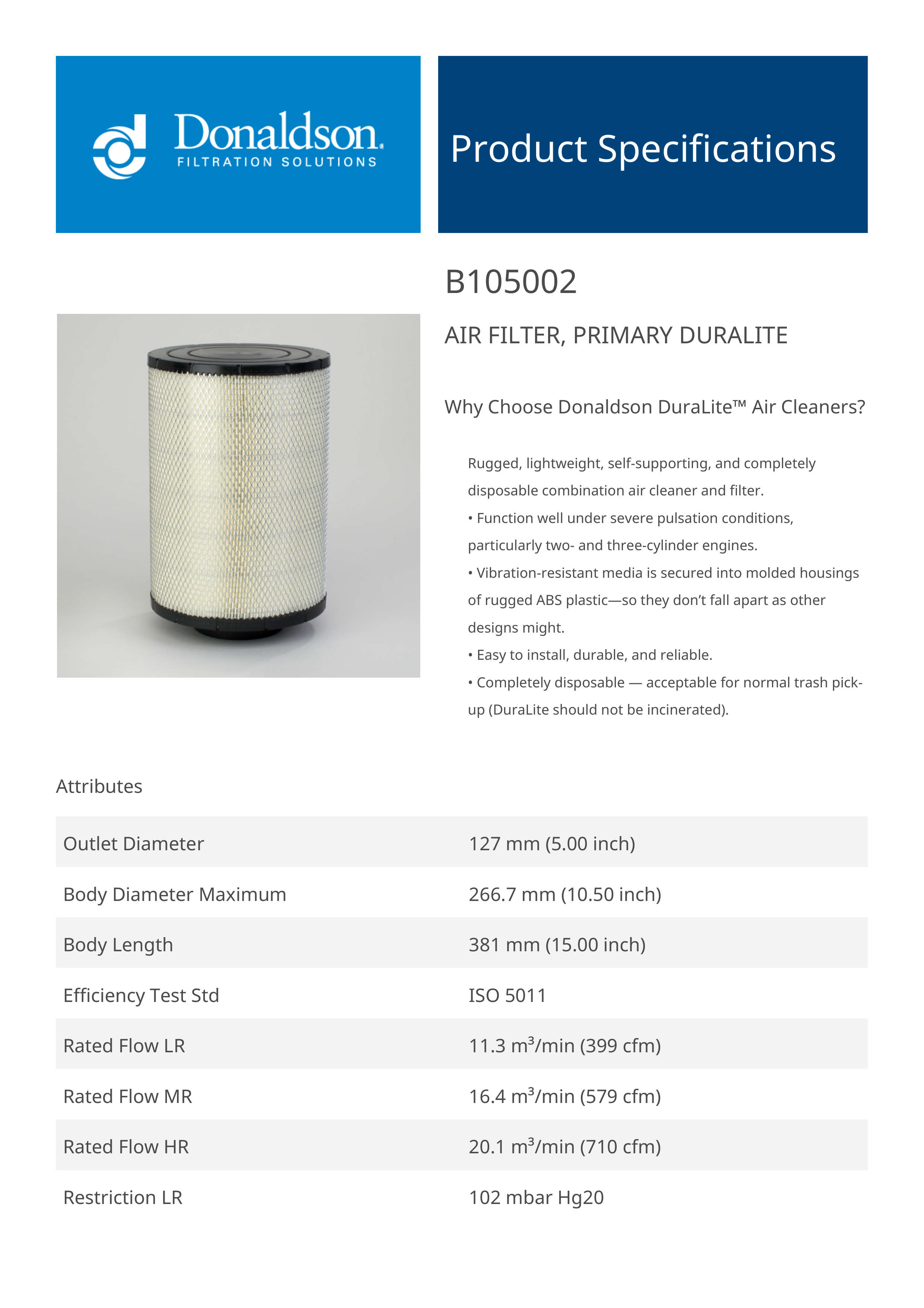 Why Choose Donaldson DuraLite™ Air Cleaners?Rugged, lightweight, self-supporting, and completely disposable combination air cleaner and filter.
