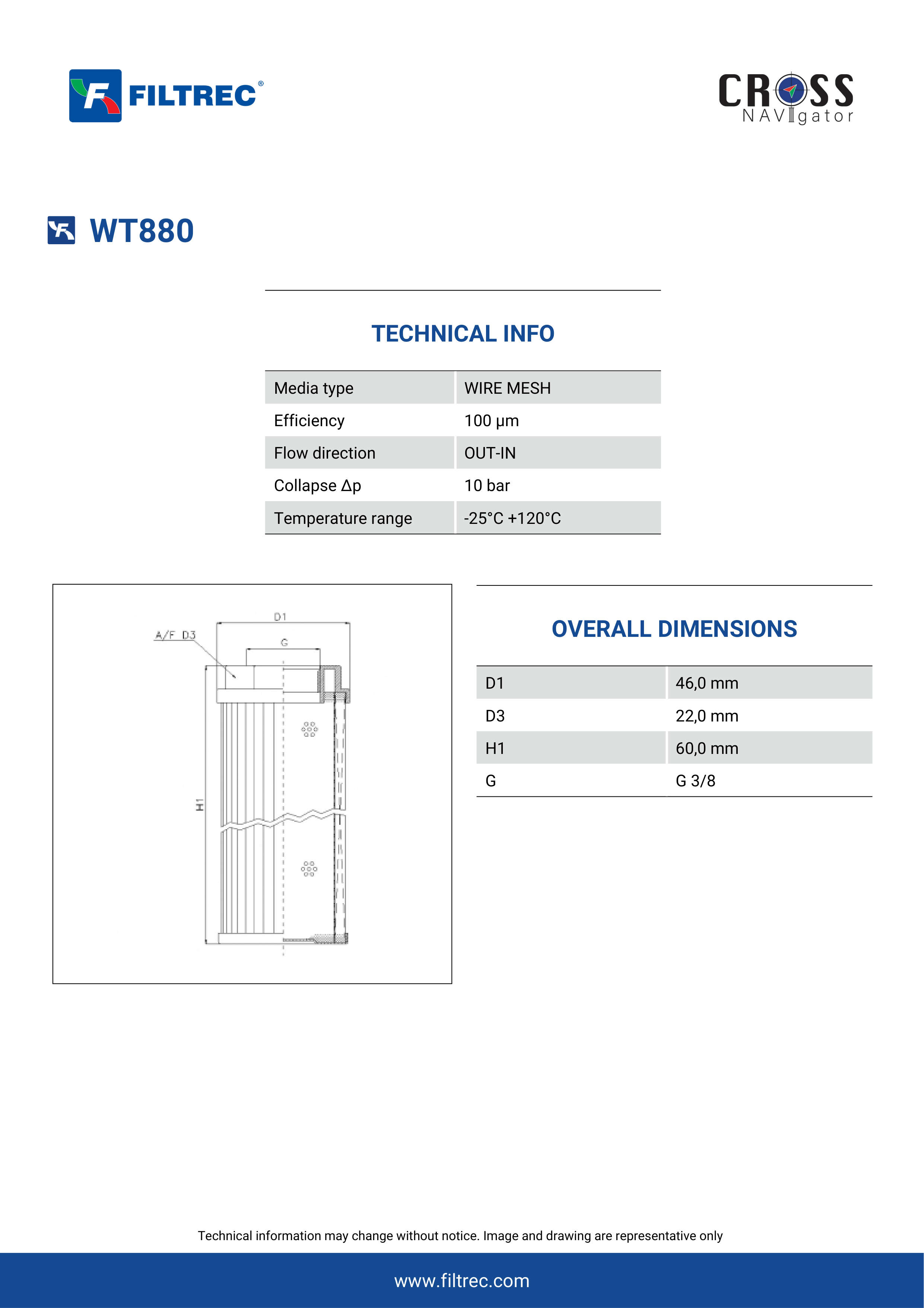 Genuine Filtrec WT880. This Filtrec element is designed to meet or exceed the quality and performance of brand OEM’s ensuring superior filtration performance and long-lasting durability.