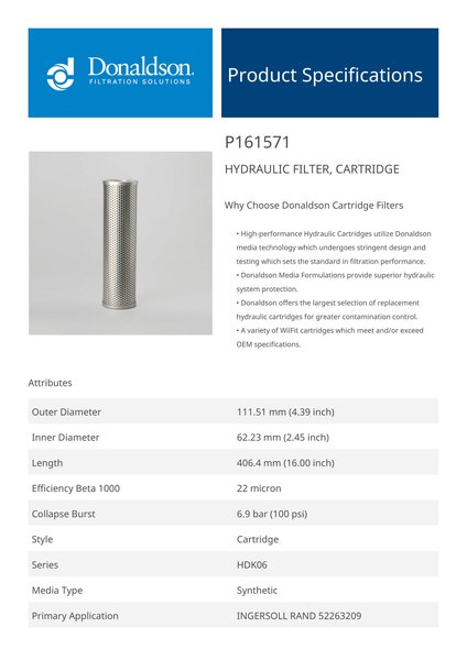 Genuine Donaldson P161571 Hydraulic Filter, Cartridge is designed to provide superior protection for your hydraulic system, effectively capturing contaminants to ensure clean fluid circulation. With high-quality filtration media, it extends equipment life, improves operational efficiency, and maintains fluid cleanliness even in the most demanding environments.