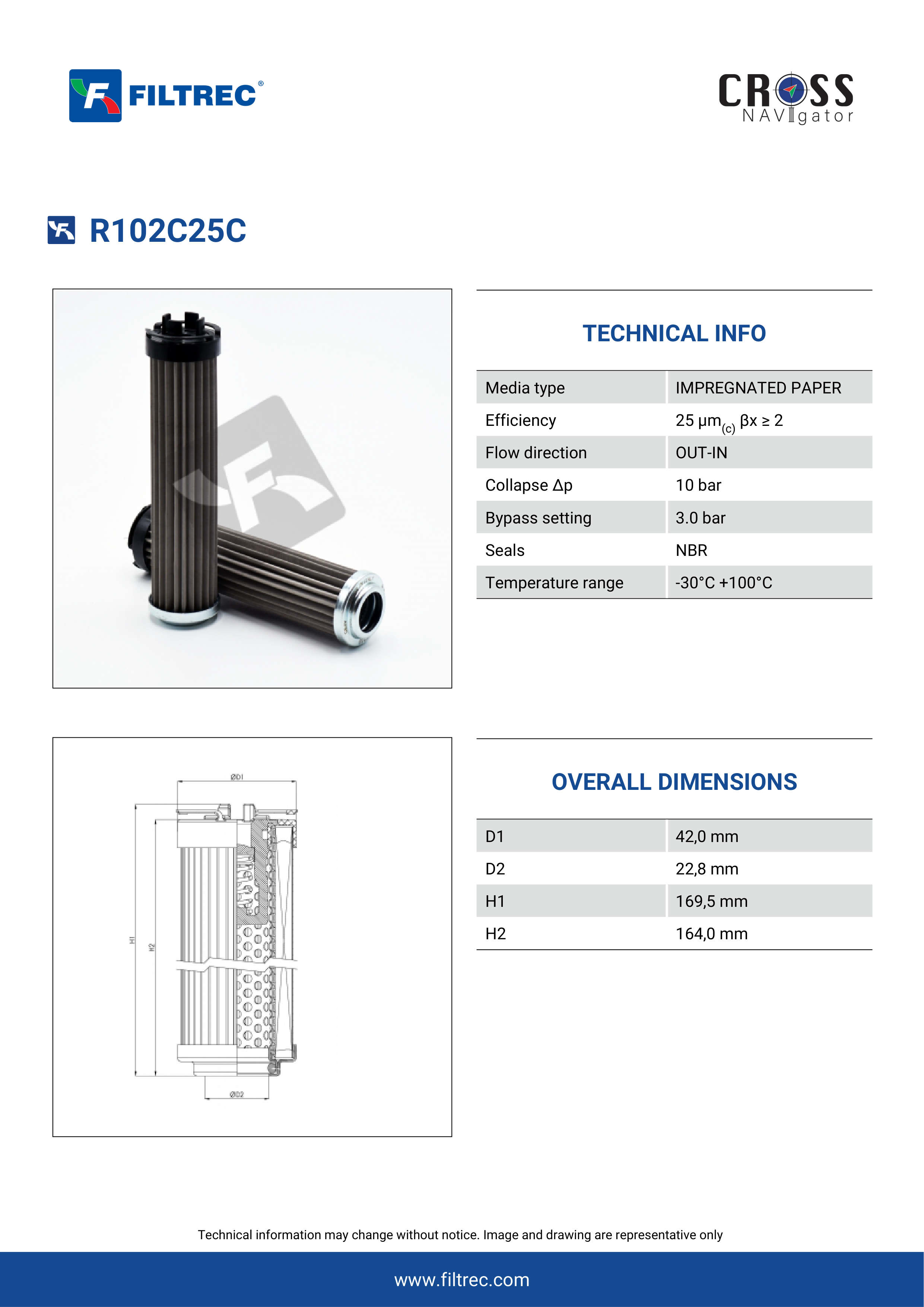 Genuine Filtrec R102C25C. This Filtrec element is designed to meet or exceed the quality and performance of brand OEM’s ensuring superior filtration performance and long-lasting durability.Engineered with their high performance media and a durable design, the R102C25C provides reliable and consistent performance over its lifespan, even in harsh operating environments. When you order from FilterFinder, you can trust that you are getting a reliable and high-quality replacement filter that will keep your system running smoothly.