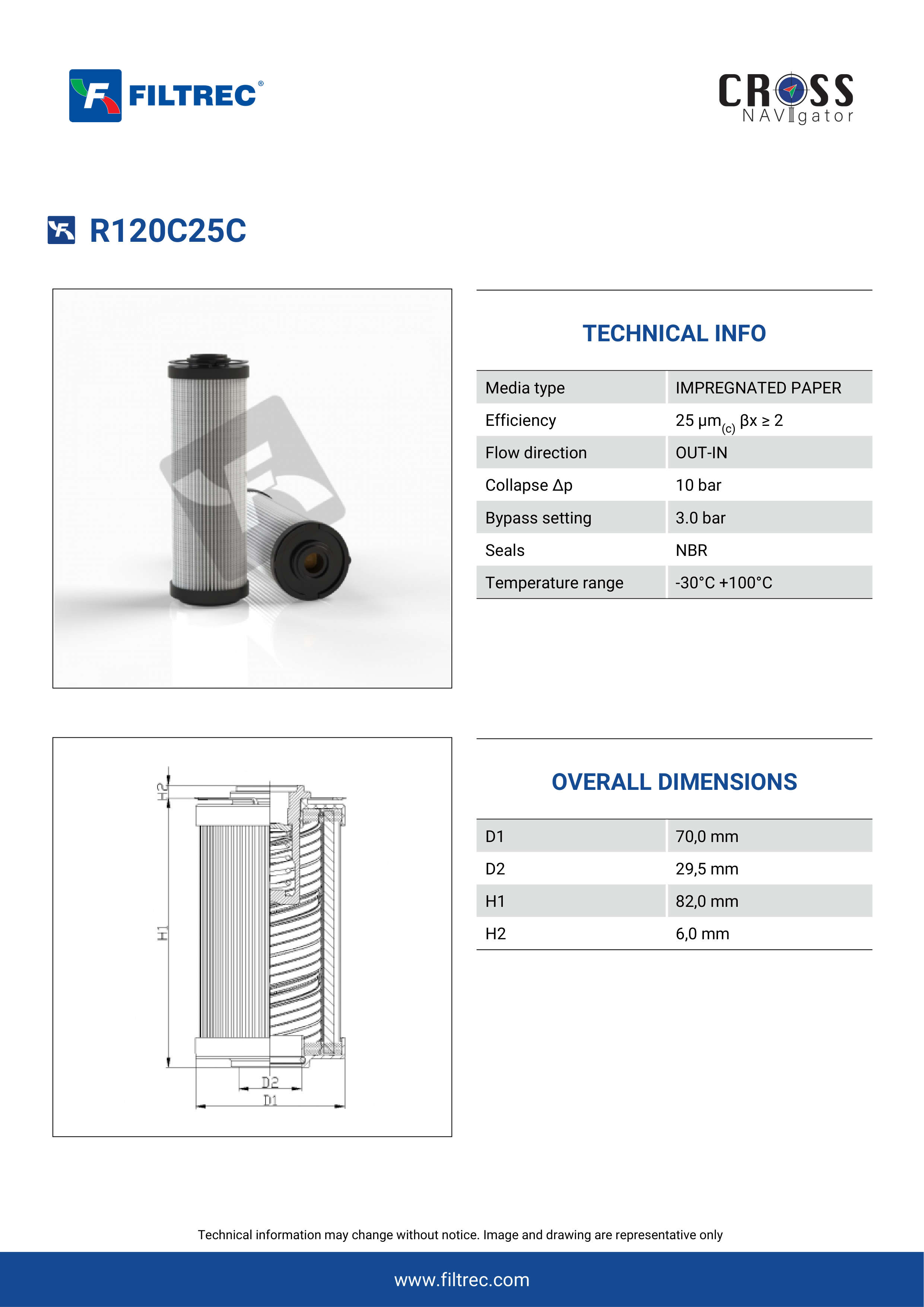 Genuine Filtrec R120C25C. This Filtrec element is designed to meet or exceed the quality and performance of brand OEM’s ensuring superior filtration performance and long-lasting durability.Engineered with their high performance media and a durable design, the R120C25C provides reliable and consistent performance over its lifespan, even in harsh operating environments. When you order from FilterFinder, you can trust that you are getting a reliable and high-quality replacement filter that will keep your system running smoothly.