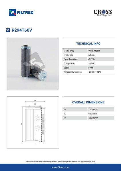 Engineered with their high performance media and a durable design, the R294T60V provides reliable and consistent performance over its lifespan, even in harsh operating environments. When you order from FilterFinder, you can trust that you are getting a reliable and high-quality replacement filter that will keep your system running smoothly.