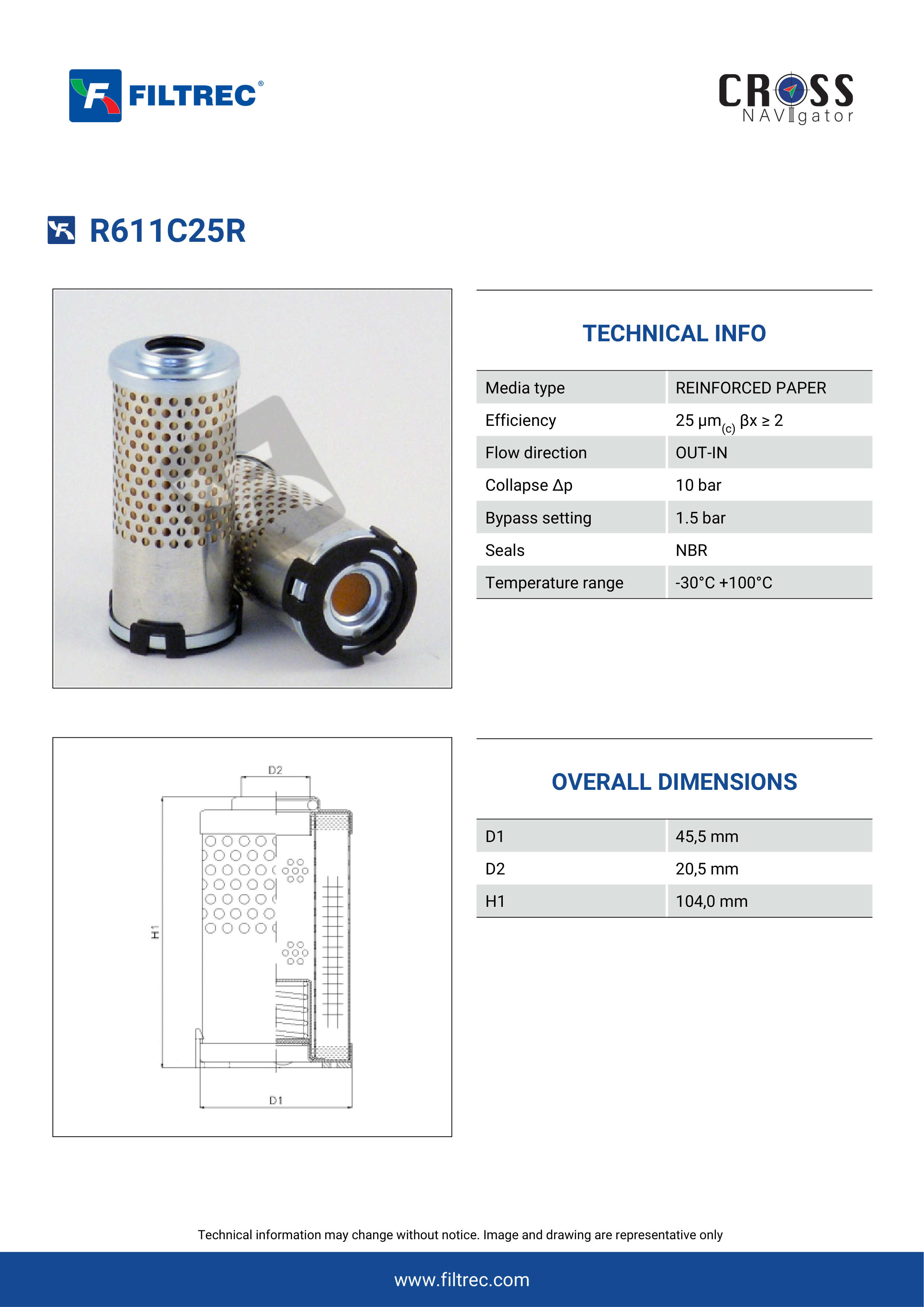 Genuine Filtrec R611C25R. This Filtrec element is designed to meet or exceed the quality and performance of brand OEM’s ensuring superior filtration performance and long-lasting durability.