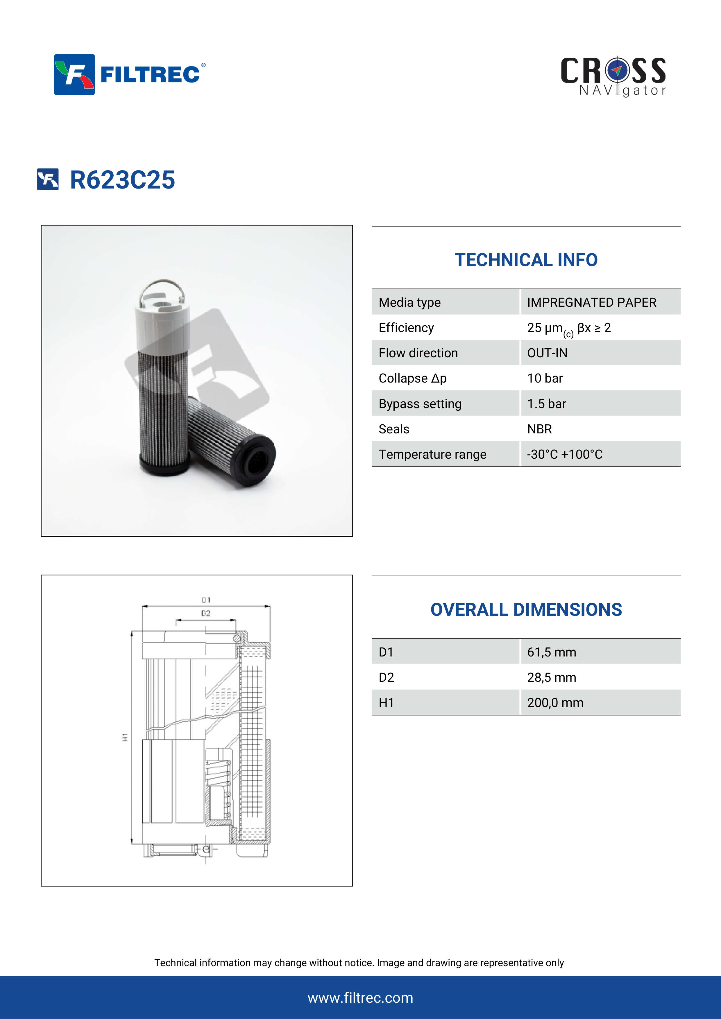 Genuine Filtrec R623C25. This Filtrec element is designed to meet or exceed the quality and performance of brand OEM’s ensuring superior filtration performance and long-lasting durability.Engineered with their high performance media and a durable design, the R623C25 provides reliable and consistent performance over its lifespan, even in harsh operating environments. When you order from FilterFinder, you can trust that you are getting a reliable and high-quality replacement filter that will keep your system running smoothly.