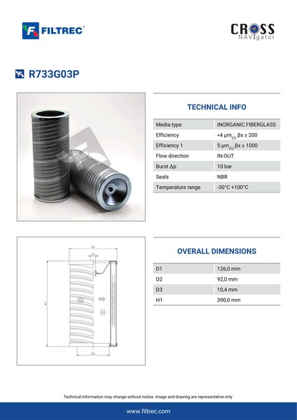 Engineered with their high performance media and a durable design, the R733G03P provides reliable and consistent performance over its lifespan, even in harsh operating environments. When you order from FilterFinder, you can trust that you are getting a reliable and high-quality replacement filter that will keep your system running smoothly.