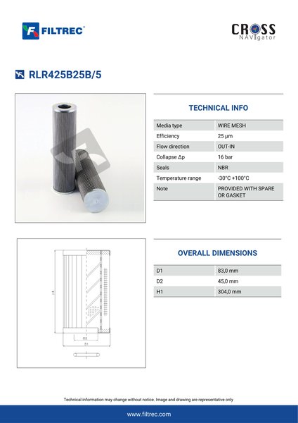 Genuine Filtrec RLR425B25B/5. This Filtrec element is designed to meet or exceed the quality and performance of brand OEM’s ensuring superior filtration performance and long-lasting durability.