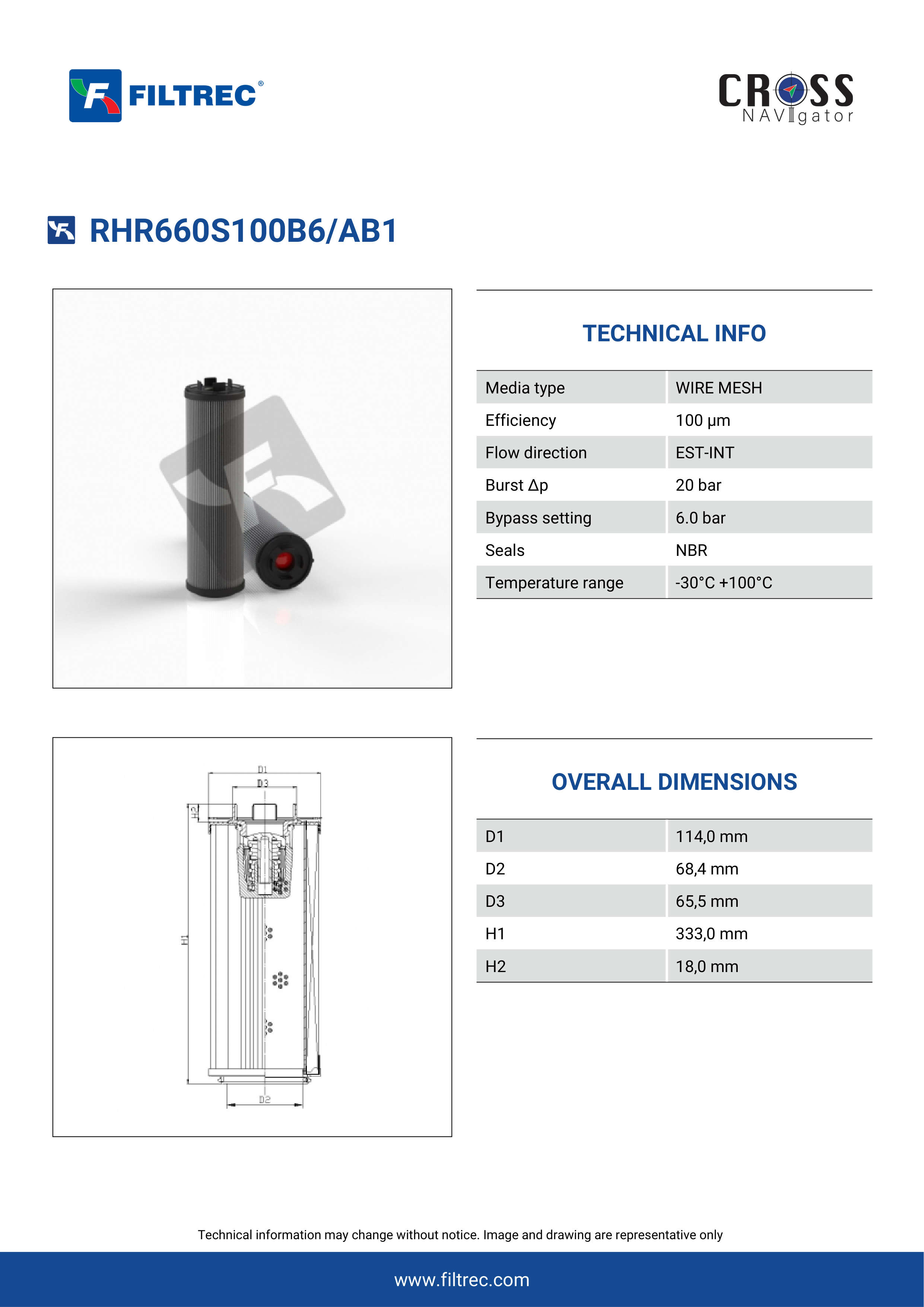 Genuine Filtrec RHR660S100B6/AB1. This Filtrec element is designed to meet or exceed the quality and performance of brand OEM’s ensuring superior filtration performance and long-lasting durability.Engineered with their high performance media and a durable design, the RHR660S100B6/AB1 provides reliable and consistent performance over its lifespan, even in harsh operating environments. When you order from FilterFinder, you can trust that you are getting a reliable and high-quality replacement filter that will keep your system running smoothly.