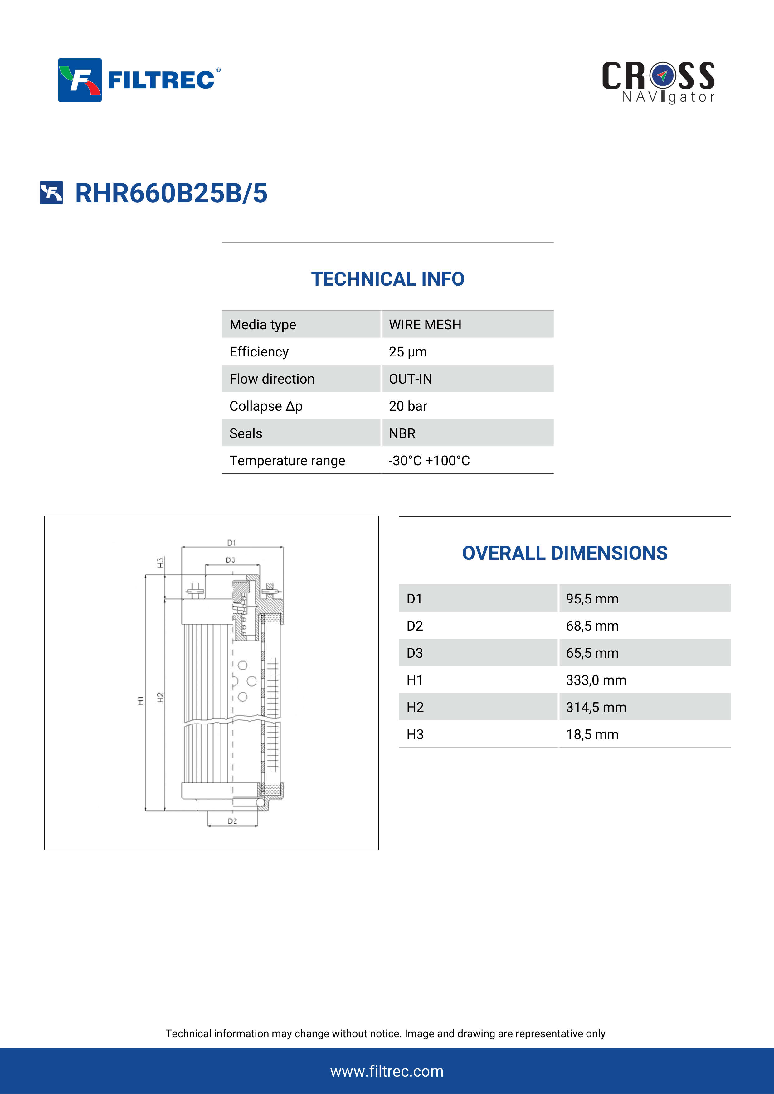 Genuine Filtrec RHR660B25B/5. This Filtrec element is designed to meet or exceed the quality and performance of brand OEM’s ensuring superior filtration performance and long-lasting durability.