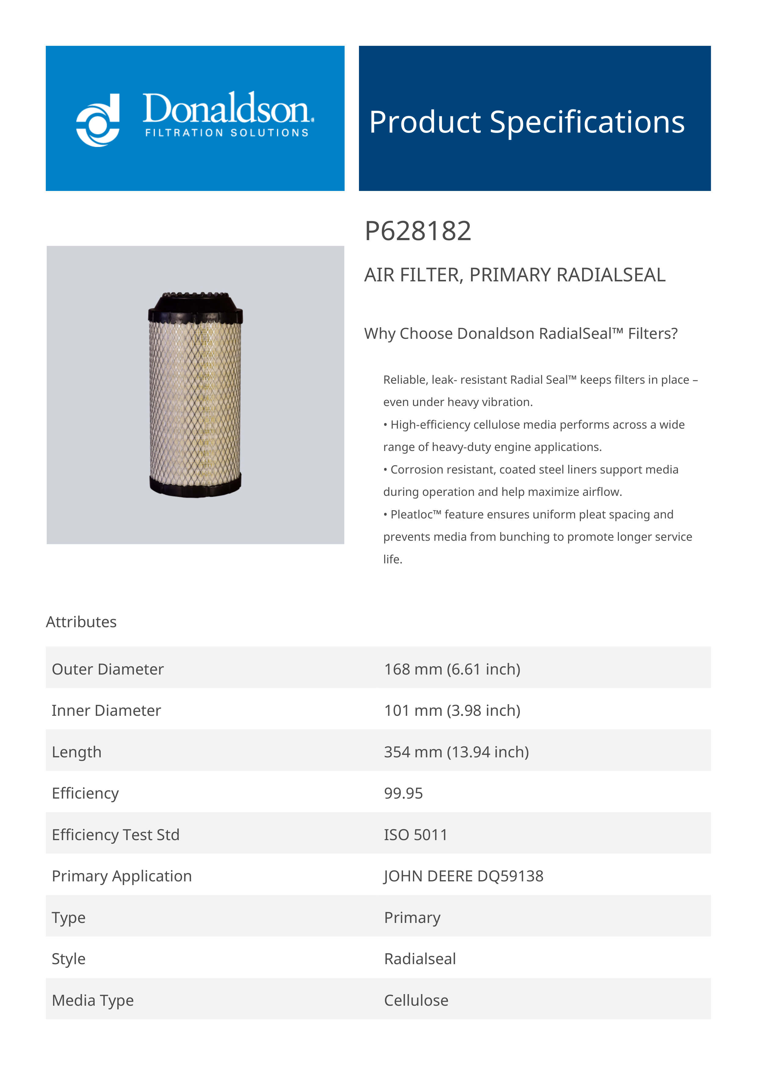 Genuine Donaldson P628182 Air Filter, Primary Radialseal features a secure radialseal fit that ensures high-efficiency air filtration while preventing unfiltered air from entering the engine. It captures harmful airborne contaminants, optimizing airflow and enhancing engine performance and longevity.